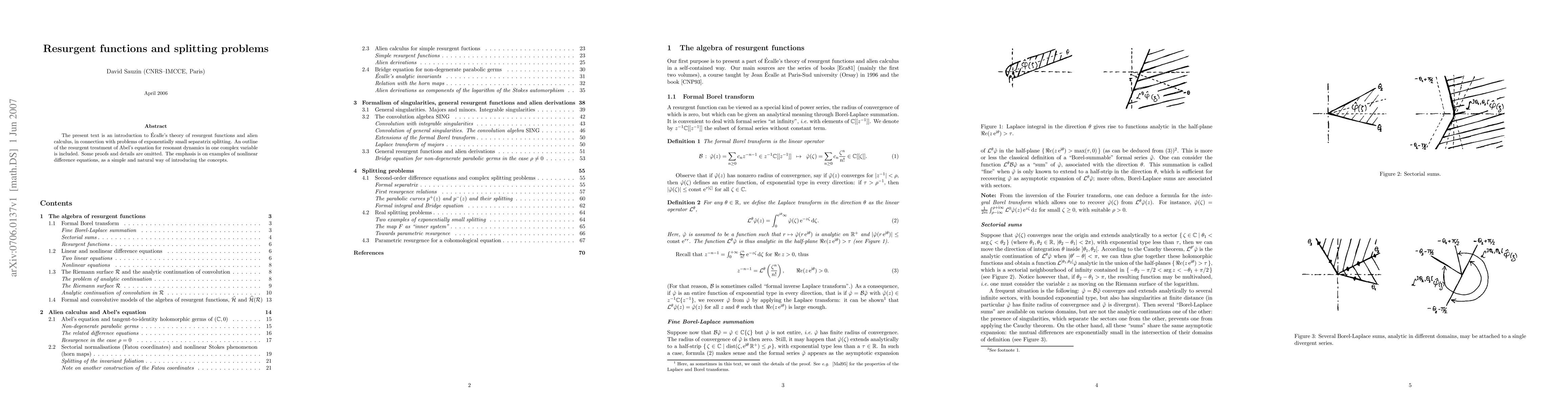 This paper introduces Écalle's theory of resurgent functions and alien calculus, focusing on the treatment of exponentially small separatrix splitting problems. It uses nonlinear difference equations to illustrate these concepts, particularly in the context of resonant dynamics and Abel's equation.