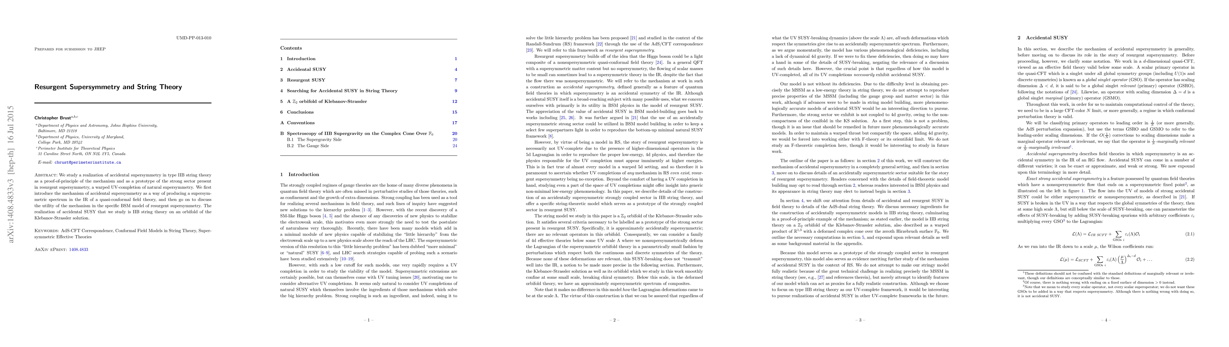 We study a realization of accidental supersymmetry in type IIB string theory as a proof-of-principle of the mechanism and as a prototype of the strong sector present in resurgent supersymmetry, a warped UV-completion of natural supersymmetry. We first introduce the mechanism of accidental supersymmetry as a way of producing a supersymmetric spectrum in the IR of a quasi-conformal field theory, and then go on to discuss the utility of the mechanism in the specific BSM model of resurgent supersymmetry. The realization of accidental SUSY that we study is IIB string theory on an orbifold of the Klebanov-Strassler solution.