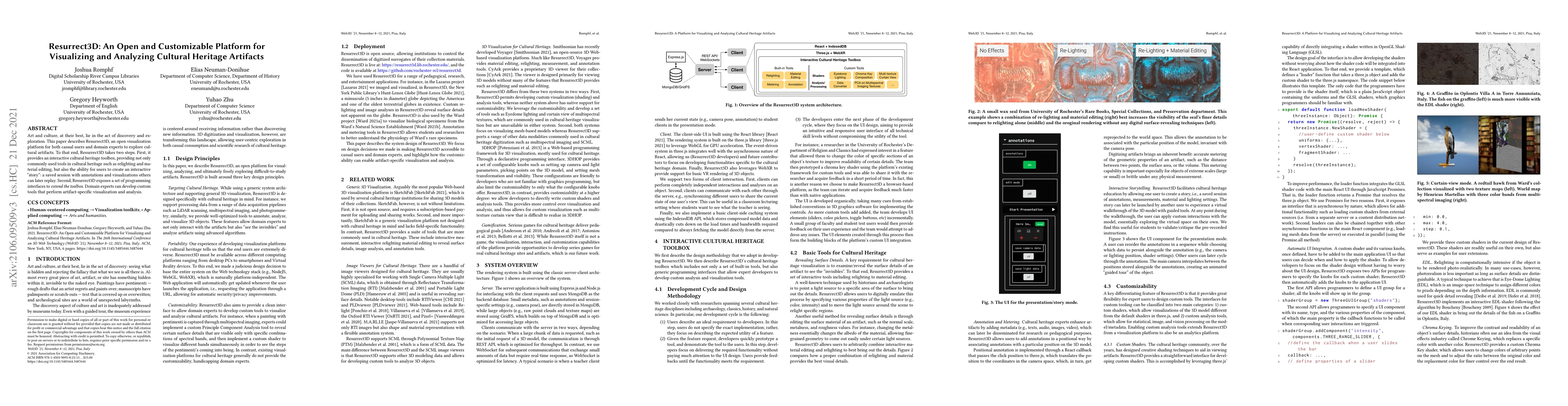 Resurrect3D is an open platform that enables users to explore cultural heritage artifacts through interactive visualization and analysis tools, allowing both casual users and domain experts to discover and analyze artifacts in new ways.