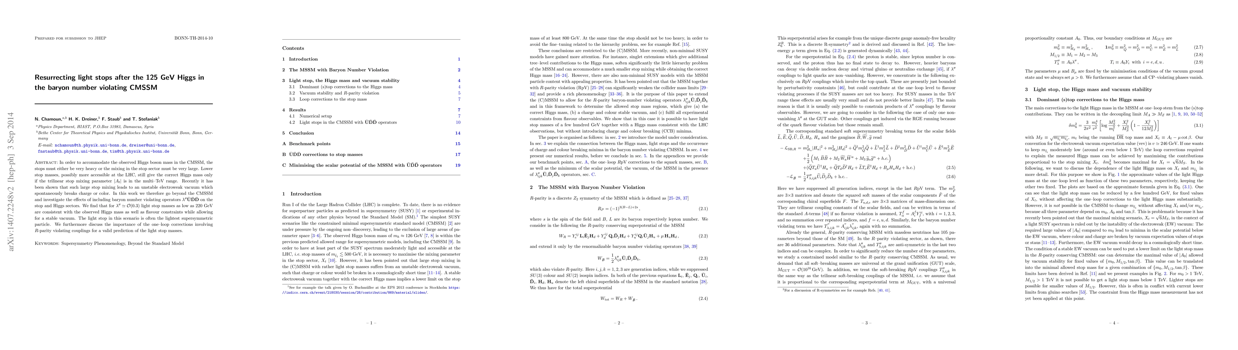 This research explores how incorporating baryon number violating operators into the Constrained Minimal Supersymmetric Standard Model (CMSSM) can stabilize the electroweak vacuum and permit lighter stop masses, as low as 220 GeV, compatible with the 125 GeV Higgs boson mass and flavor constraints. The lightest supersymmetric particle is often the light stop in this scenario, with one-loop corrections from R-parity violating couplings crucial for accurate mass predictions.