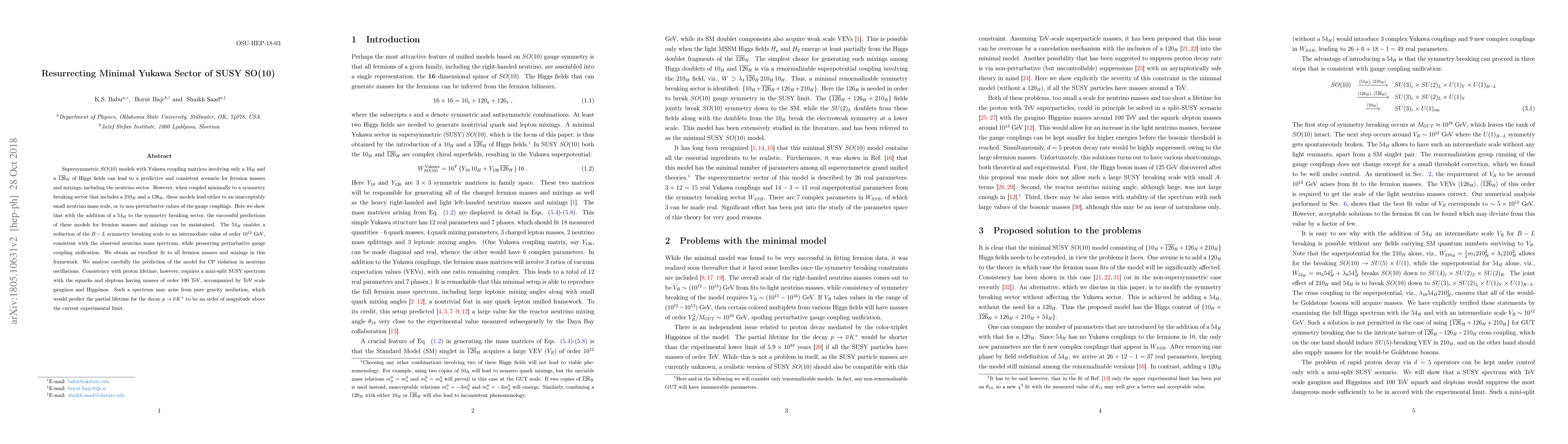 This paper explores supersymmetric $SO(10)$ models with minimal Yukawa sectors, demonstrating that adding a $54_H$ to the symmetry breaking sector can maintain successful predictions for fermion masses and mixings while preserving perturbative gauge coupling unification and an intermediate $B-L$ symmetry breaking scale. However, achieving consistency with proton lifetime necessitates a mini-split SUSY spectrum with high squark and slepton masses.