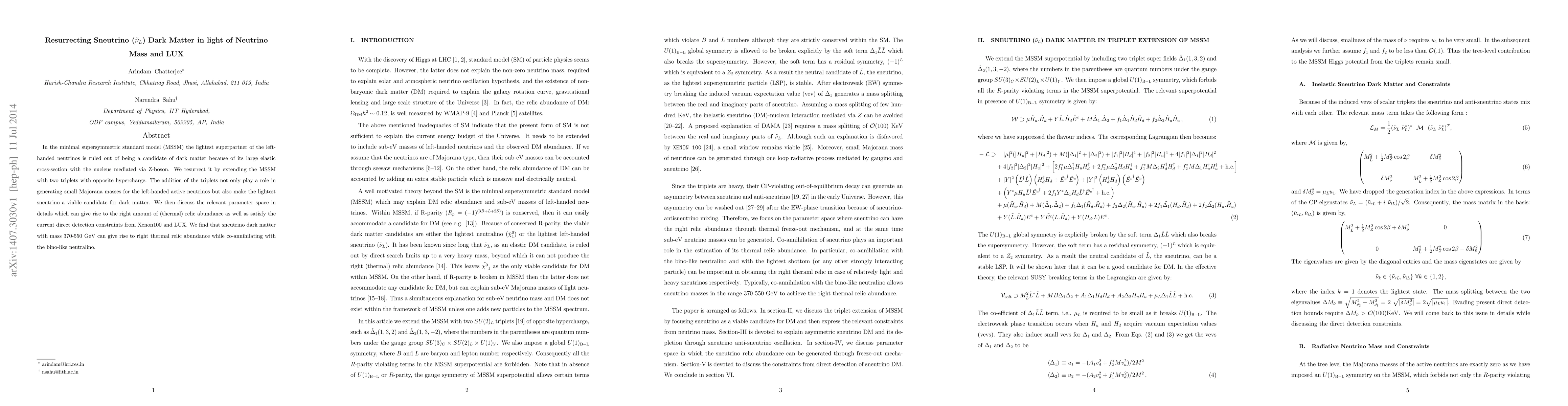 In the minimal supersymmetric standard model (MSSM) the lightest superpartner of the left-handed neutrinos is ruled out of being a candidate of dark matter because of its large elastic cross-section with the nucleus mediated via Z-boson. We resurrect it by extending the MSSM with two triplets with opposite hypercharge. The addition of the triplets not only play a role in generating small Majorana masses for the left-handed active neutrinos but also make the lightest sneutrino a viable candidate for dark matter. We then discuss the relevant parameter space in details which can give rise to the right amount of (thermal) relic abundance as well as satisfy the current direct detection constraints from Xenon100 and LUX. We find that sneutrino dark matter with mass 370-550 GeV can give rise to right thermal relic abundance while co-annihilating with the bino-like neutralino.