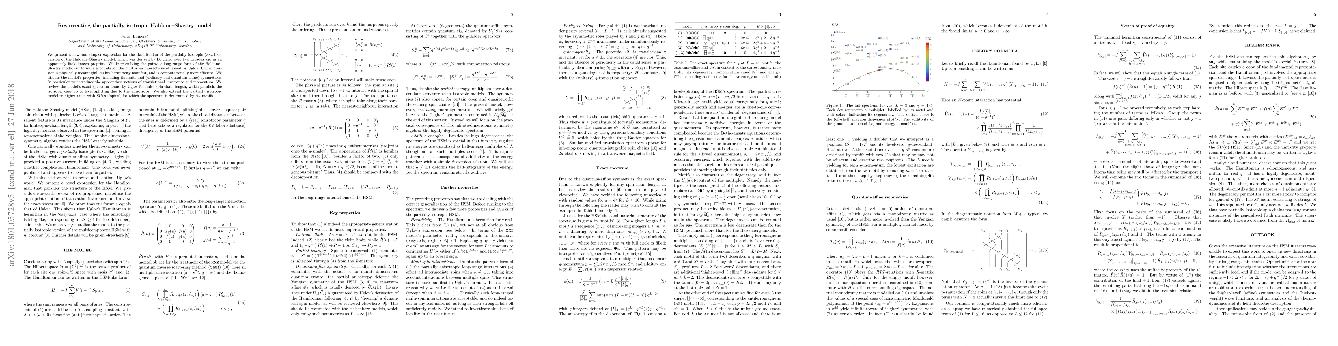 We present a new and simpler expression for the Hamiltonian of the partially isotropic (XXZ-like) version of the Haldane-Shastry model, which was derived by D. Uglov over two decades ago in an apparently little-known preprint. While resembling the pairwise long-range form of the Haldane-Shastry model our formula accounts for the multi-spin interactions obtained by Uglov. Our expression is physically meaningful, makes hermiticity manifest, and is computationally more efficient. We discuss the model's properties, including its limits and (ordinary and quantum-affine) symmetries. In particular we introduce the appropriate notions of translational invariance and momentum. We review the model's exact spectrum found by Uglov for finite spin-chain length, which parallels the isotropic case up to level splitting due to the anisotropy. We also extend the partially isotropic model to higher rank, with $SU(n)$ 'spins', for which the spectrum is determined by $\mathfrak{sl}_n$-motifs.