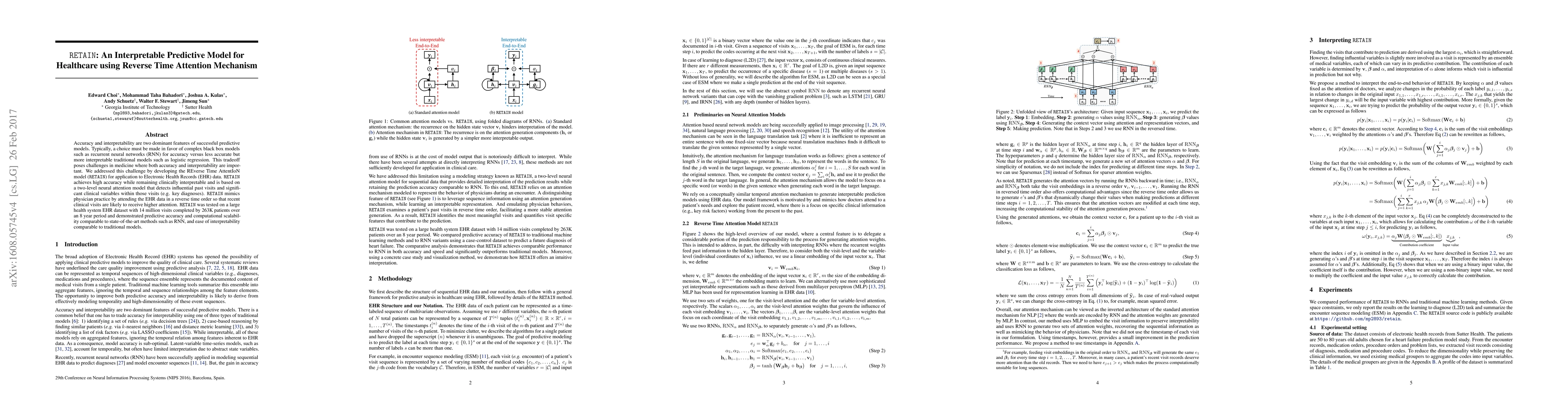 The RETAIN model integrates a reverse time attention mechanism to create a predictive model for healthcare that balances high accuracy with interpretability, addressing the common trade-off between complex, accurate models and simpler, more interpretable ones. It was tested on a large EHR dataset, showing competitive accuracy and scalability while maintaining clinical interpretability.