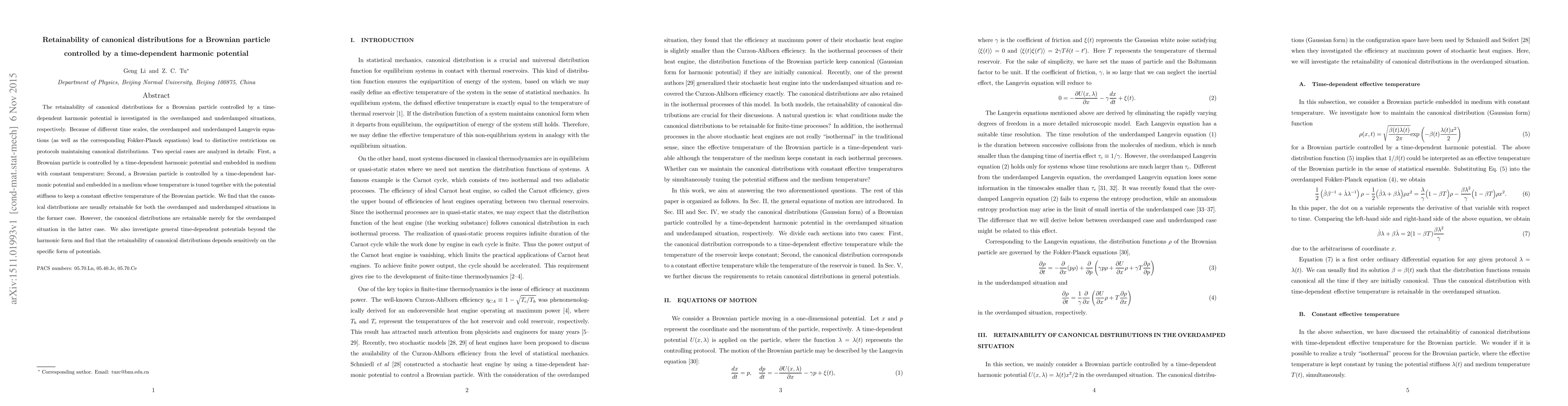 This paper explores the retainability of canonical distributions for a Brownian particle under a time-dependent harmonic potential in both overdamped and underdamped regimes. It finds that canonical distributions are generally maintainable in the former scenario but only in the overdamped case when the medium's temperature is adjusted with the potential stiffness.