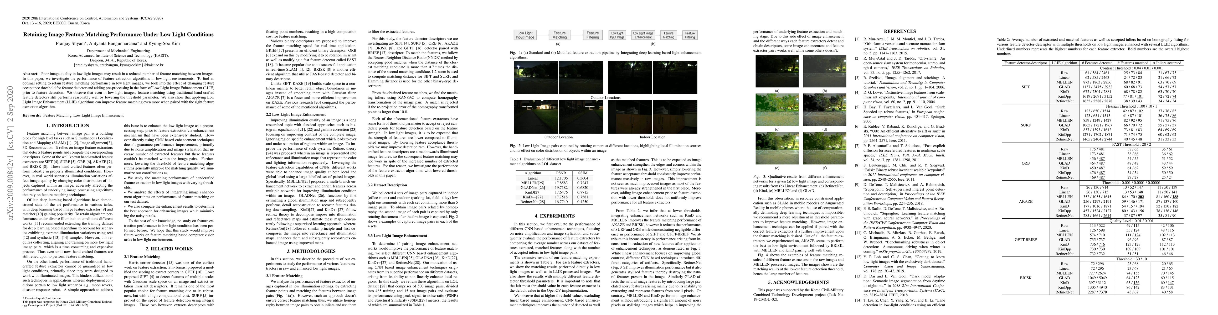 Researchers found that feature matching algorithms can still perform well in low light images with adjustments to threshold parameters, and that pre-processing techniques like Low Light Image Enhancement (LLIE) can further improve performance.