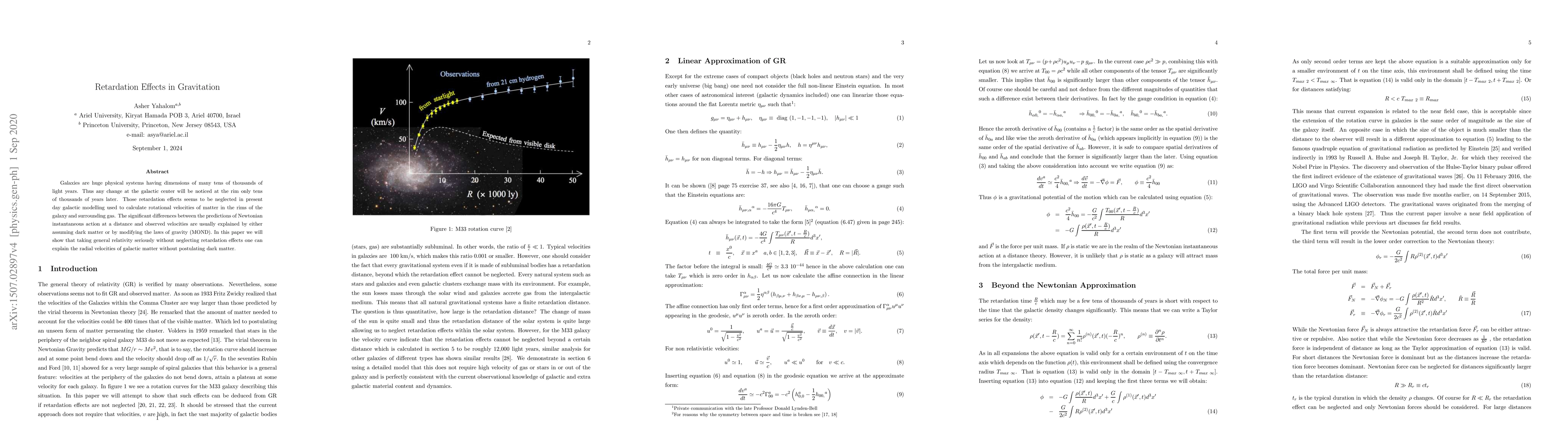 This paper argues that retardation effects in general relativity, which account for the time delay in signals traveling across galaxies, can explain observed rotational velocities without invoking dark matter or modifying gravitational laws. Current galactic models often overlook these effects, leading to discrepancies that are typically addressed by dark matter or alternative gravity theories.
