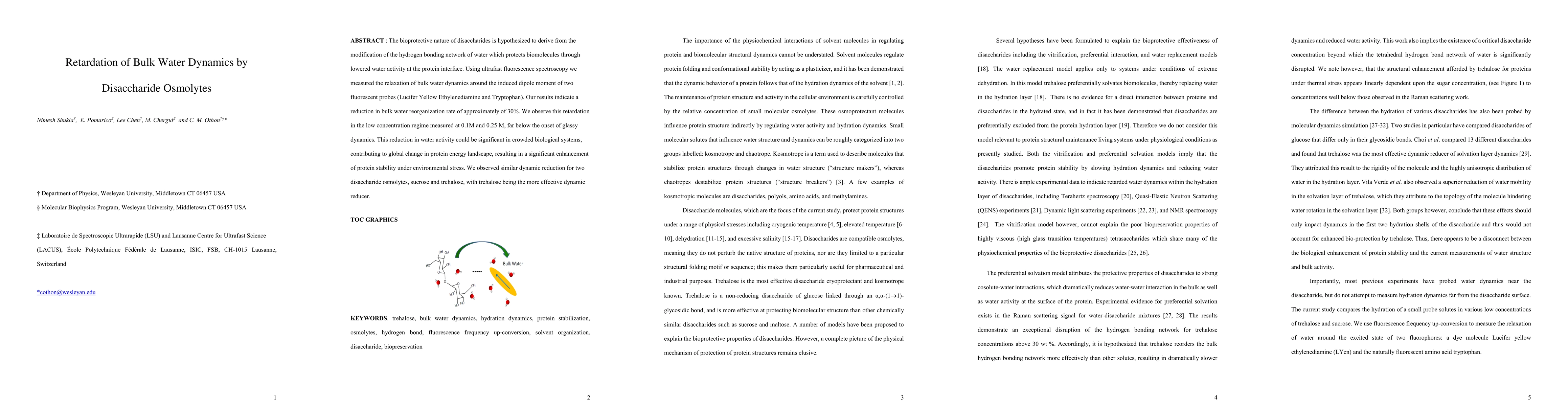 This study uses ultrafast fluorescence spectroscopy to show that disaccharide osmolytes like sucrose and trehalose reduce the reorganization rate of bulk water by about 30%, suggesting enhanced protein stability under environmental stress. Trehalose was found to be more effective than sucrose in this role.