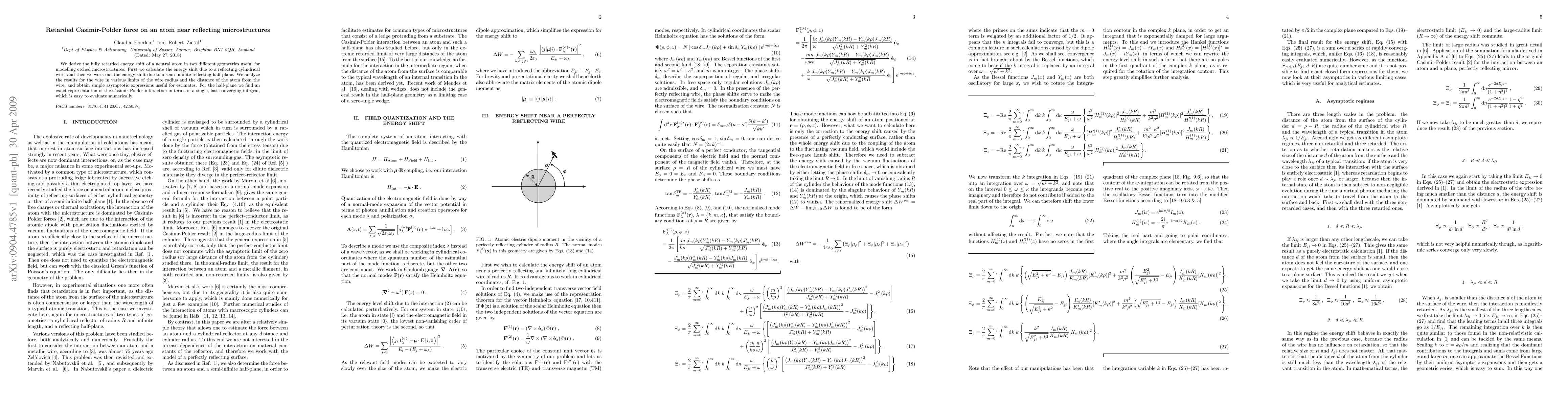 This paper derives the fully retarded energy shift of a neutral atom near cylindrical wires and semi-infinite reflecting half-planes, providing simple asymptotic expressions for the wire and a fast converging integral for the half-plane, useful for modeling etched microstructures.