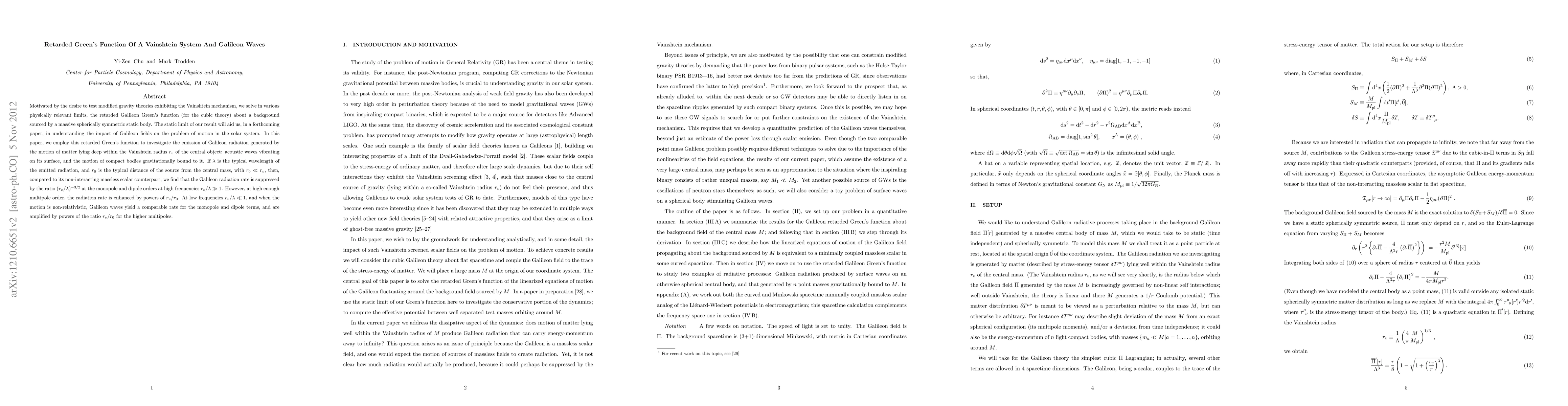 Motivated by the desire to test modified gravity theories exhibiting the Vainshtein mechanism, we solve in various physically relevant limits, the retarded Galileon Green's function (for the cubic theory) about a background sourced by a massive spherically symmetric static body. The static limit of our result will aid us, in a forthcoming paper, in understanding the impact of Galileon fields on the problem of motion in the solar system. In this paper, we employ this retarded Green's function to investigate the emission of Galileon radiation generated by the motion of matter lying deep within the Vainshtein radius r_v of the central object: acoustic waves vibrating on its surface, and the motion of compact bodies gravitationally bound to it. If \lambda is the typical wavelength of the emitted radiation, and r_0 is the typical distance of the source from the central mass, with r_0 << r_v, then, compared to its non-interacting massless scalar counterpart, we find that the Galileon radiation rate is suppressed by the ratio (r_v/\lambda)^{-3/2} at the monopole and dipole orders at high frequencies r_v/\lambda >> 1. However, at high enough multipole order, the radiation rate is enhanced by powers of r_v/r_0. At low frequencies r_v/\lambda << 1, and when the motion is non-relativistic, Galileon waves yield a comparable rate for the monopole and dipole terms, and are amplified by powers of the ratio r_v/r_0 for the higher multipoles.