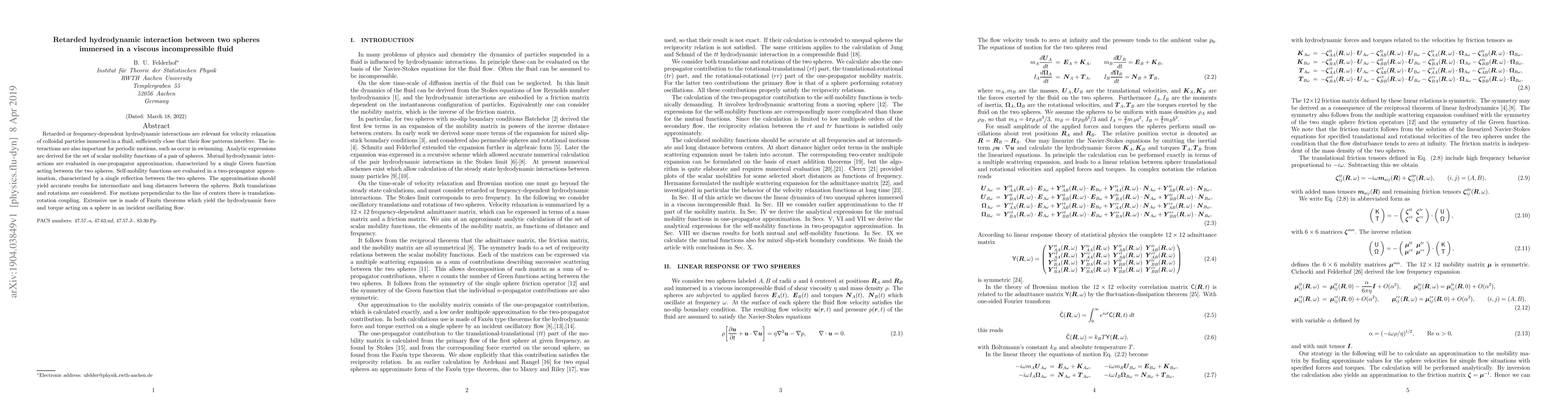 This paper derives analytic expressions for retarded hydrodynamic interactions between two spheres in a viscous fluid, focusing on scalar mobility functions. It employs approximations using Green functions and Faxén theorems to evaluate mutual and self-mobility, considering both translational and rotational motions, and finds these approximations effective for intermediate and long distances.