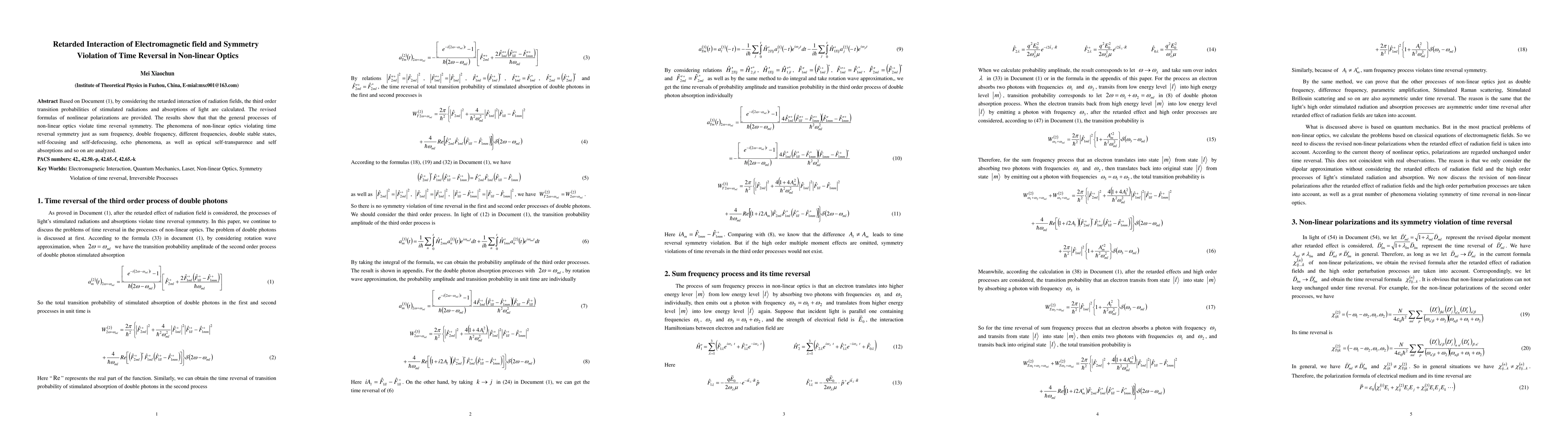 Based on Document (1), by considering the retarded interaction of radiation fields, the third order transition probabilities of stimulated radiations and absorptions of light are calculated. The revised formulas of nonlinear polarizations are provided. The results show that that the general processes of non-linear optics violate time reversal symmetry. The phenomena of non-linear optics violating time reversal symmetry just as sum frequency, double frequency, different frequencies, double stable states, self-focusing and self-defocusing, echo phenomena, as well as optical self-transparence and self absorptions and so on are analyzed.