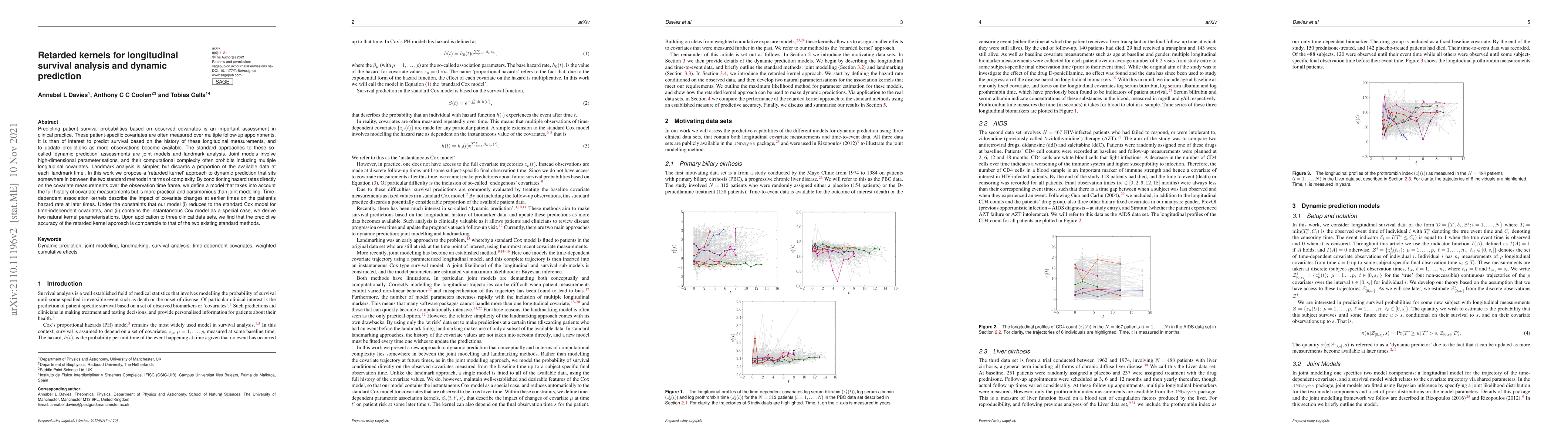 Predicting patient survival probabilities based on observed covariates is an important assessment in clinical practice. These patient-specific covariates are often measured over multiple follow-up appointments. It is then of interest to predict survival based on the history of these longitudinal measurements, and to update predictions as more observations become available. The standard approaches to these so-called `dynamic prediction' assessments are joint models and landmark analysis. Joint models involve high-dimensional parametrisations, and their computational complexity often prohibits including multiple longitudinal covariates. Landmark analysis is simpler, but discards a proportion of the available data at each `landmark time'. In this work we propose a `retarded kernel' approach to dynamic prediction that sits somewhere in between the two standard methods in terms of complexity. By conditioning hazard rates directly on the covariate measurements over the observation time frame, we define a model that takes into account the full history of covariate measurements but is more practical and parsimonious than joint modelling. Time-dependent association kernels describe the impact of covariate changes at earlier times on the patient's hazard rate at later times. Under the constraints that our model (i) reduces to the standard Cox model for time-independent covariates, and (ii) contains the instantaneous Cox model as a special case, we derive two natural kernel parameterisations. Upon application to three clinical data sets, we find that the predictive accuracy of the retarded kernel approach is comparable to that of the two existing standard methods.