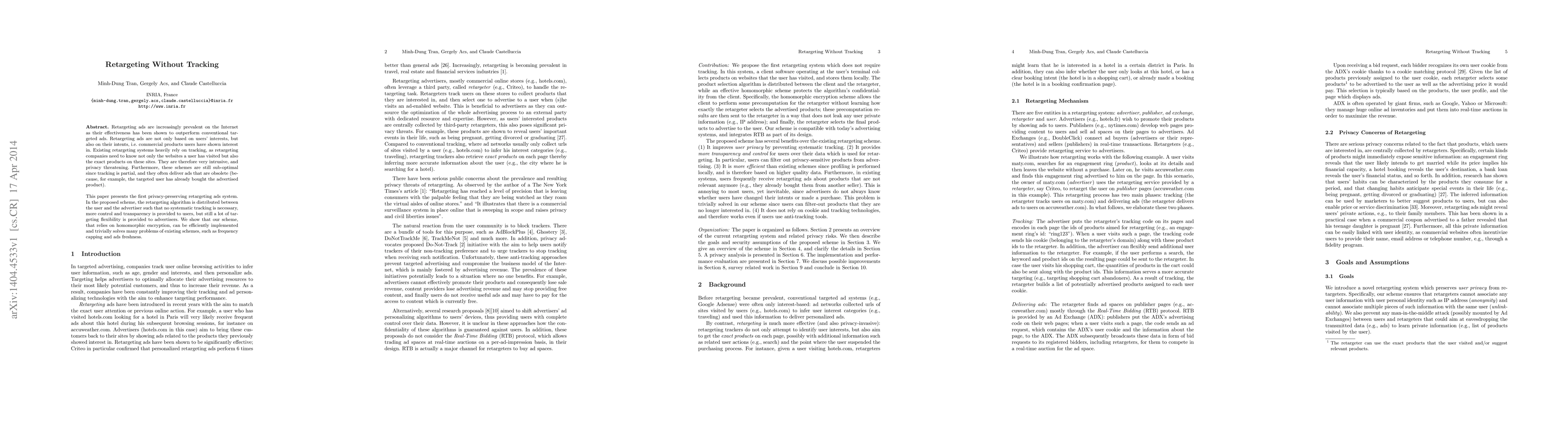 This paper introduces a privacy-preserving retargeting ads system that distributes the retargeting algorithm between users and advertisers, eliminating the need for systematic tracking. The proposed scheme, utilizing homomorphic encryption, enhances user control and transparency while maintaining targeting flexibility for advertisers.