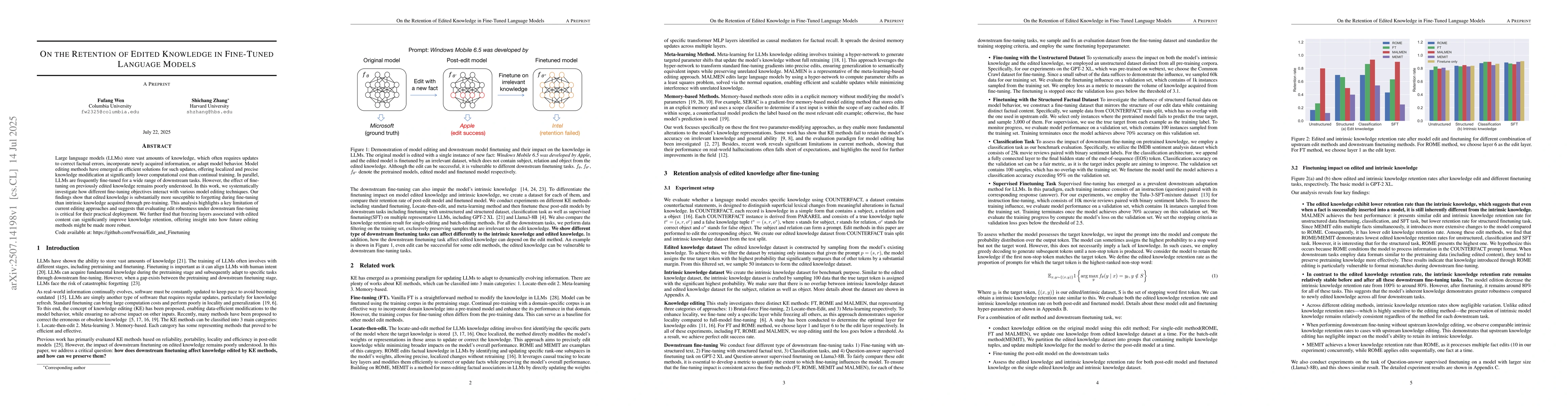 Large language models (LLMs) store vast amounts of knowledge, which often requires updates to correct factual errors, incorporate newly acquired information, or adapt model behavior. Model editing methods have emerged as efficient solutions for such updates, offering localized and precise knowledge modification at significantly lower computational cost than continual training. In parallel, LLMs are frequently fine-tuned for a wide range of downstream tasks. However, the effect of fine-tuning on previously edited knowledge remains poorly understood. In this work, we systematically investigate how different fine-tuning objectives interact with various model editing techniques. Our findings show that edited knowledge is substantially more susceptible to forgetting during fine-tuning than intrinsic knowledge acquired through pre-training. This analysis highlights a key limitation of current editing approaches and suggests that evaluating edit robustness under downstream fine-tuning is critical for their practical deployment. We further find that freezing layers associated with edited content can significantly improve knowledge retention, offering insight into how future editing methods might be made more robust.