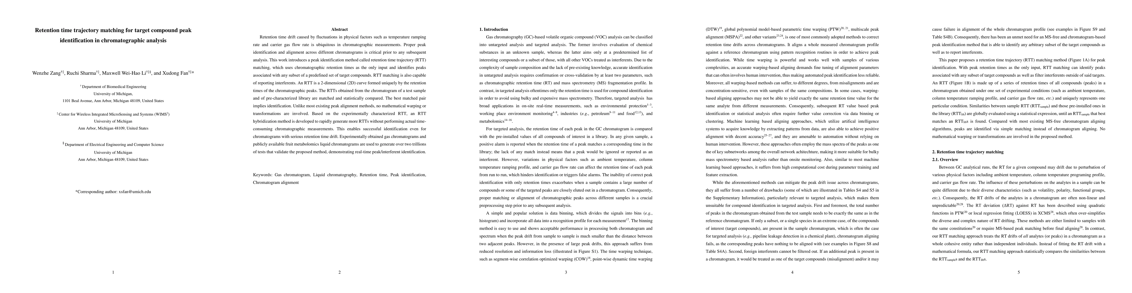 This paper introduces a novel retention time trajectory (RTT) matching method for identifying target compound peaks in chromatographic analysis, addressing retention time drift issues without requiring mathematical warping. The RTT method statistically compares 2D RTT curves from test samples and library samples for peak identification and interference reporting.
