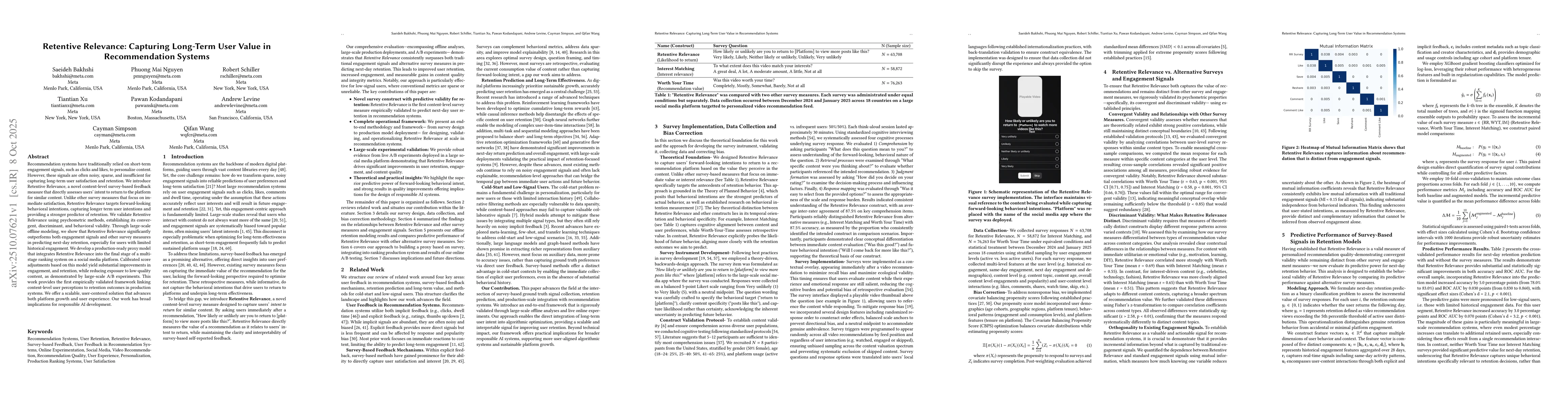 Introduces Retentive Relevance as the first forward-looking measure for recommendation system evaluation, combining survey-based intent capture with machine learning validation, which differs from traditional retrospective satisfaction metrics.