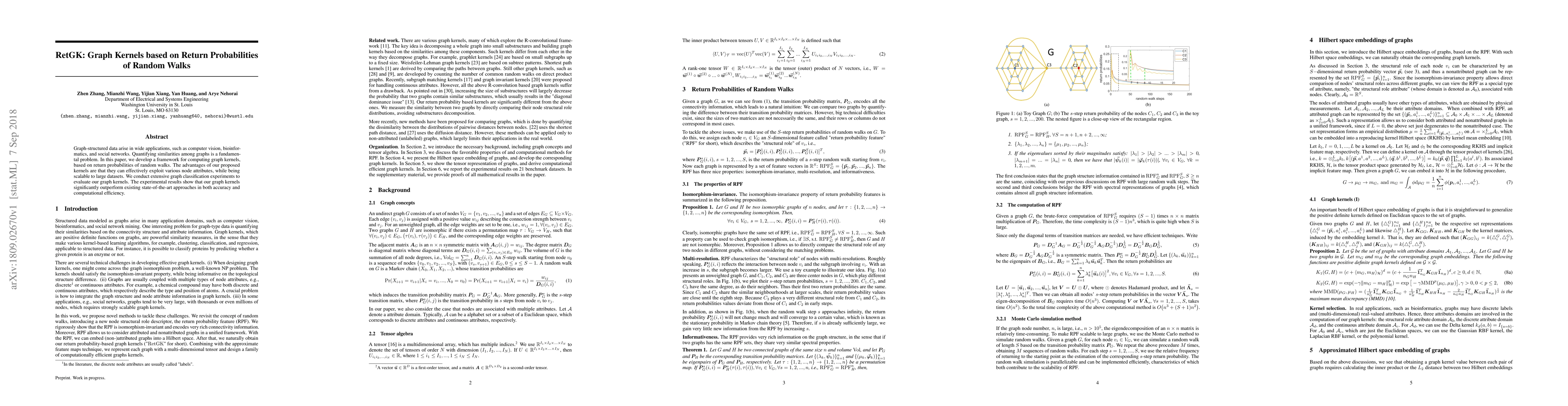 This paper presents RetGK, a novel graph kernel framework based on return probabilities of random walks, which effectively leverages node attributes and scales to large datasets. Experimental results demonstrate superior performance over existing methods in graph classification tasks.