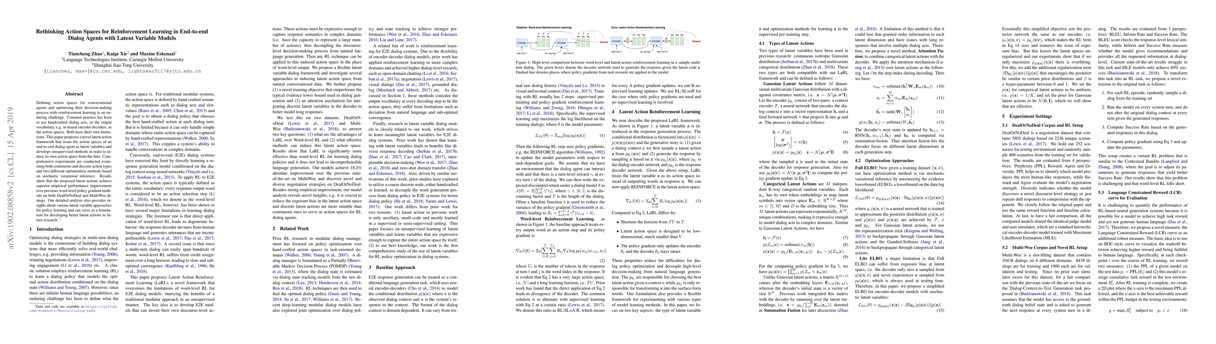 This paper proposes a novel latent variable framework for reinforcement learning in end-to-end dialog agents, moving beyond traditional handcrafted action spaces. The method induces action spaces from data, demonstrating superior performance over word-level policy gradient methods in experiments.