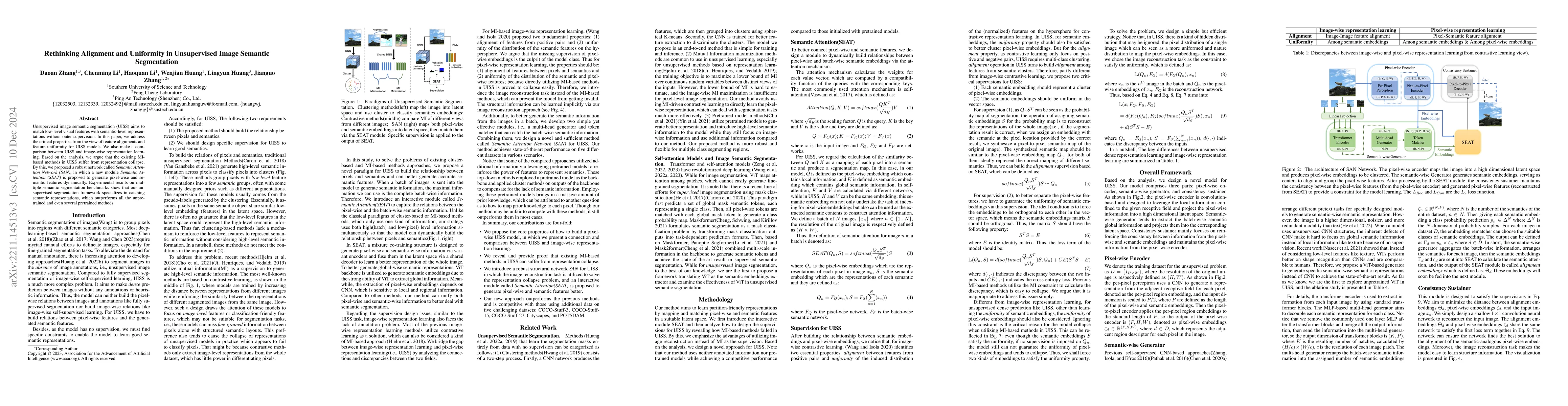 Unsupervised image semantic segmentation(UISS) aims to match low-level visual features with semantic-level representations without outer supervision. In this paper, we address the critical properties from the view of feature alignments and feature uniformity for UISS models. We also make a comparison between UISS and image-wise representation learning. Based on the analysis, we argue that the existing MI-based methods in UISS suffer from representation collapse. By this, we proposed a robust network called Semantic Attention Network(SAN), in which a new module Semantic Attention(SEAT) is proposed to generate pixel-wise and semantic features dynamically. Experimental results on multiple semantic segmentation benchmarks show that our unsupervised segmentation framework specializes in catching semantic representations, which outperforms all the unpretrained and even several pretrained methods.