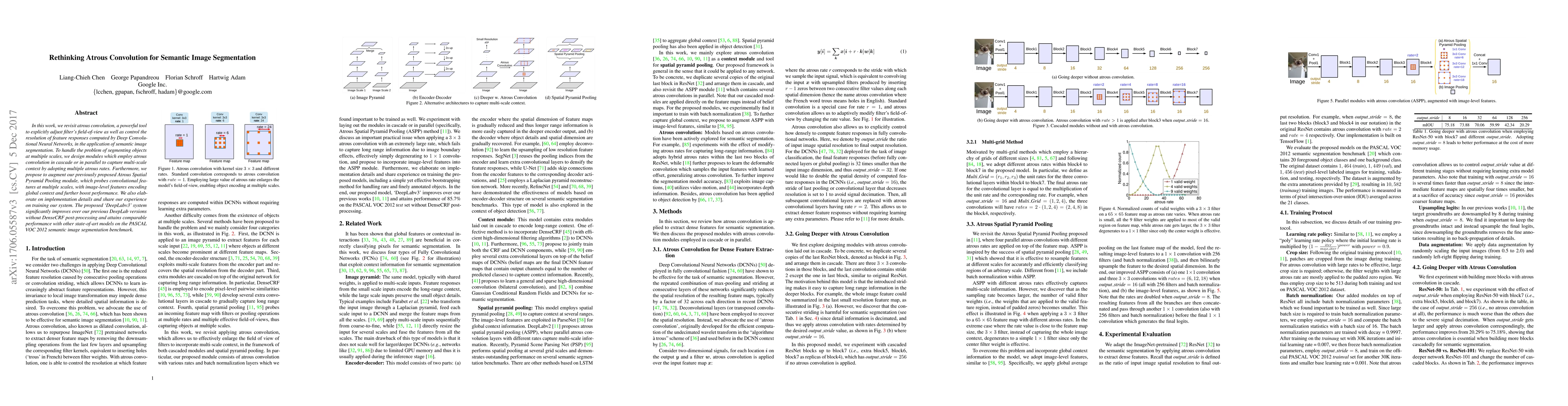 In this work, we revisit atrous convolution, a powerful tool to explicitly adjust filter's field-of-view as well as control the resolution of feature responses computed by Deep Convolutional Neural Networks, in the application of semantic image segmentation. To handle the problem of segmenting objects at multiple scales, we design modules which employ atrous convolution in cascade or in parallel to capture multi-scale context by adopting multiple atrous rates. Furthermore, we propose to augment our previously proposed Atrous Spatial Pyramid Pooling module, which probes convolutional features at multiple scales, with image-level features encoding global context and further boost performance. We also elaborate on implementation details and share our experience on training our system. The proposed `DeepLabv3' system significantly improves over our previous DeepLab versions without DenseCRF post-processing and attains comparable performance with other state-of-art models on the PASCAL VOC 2012 semantic image segmentation benchmark.