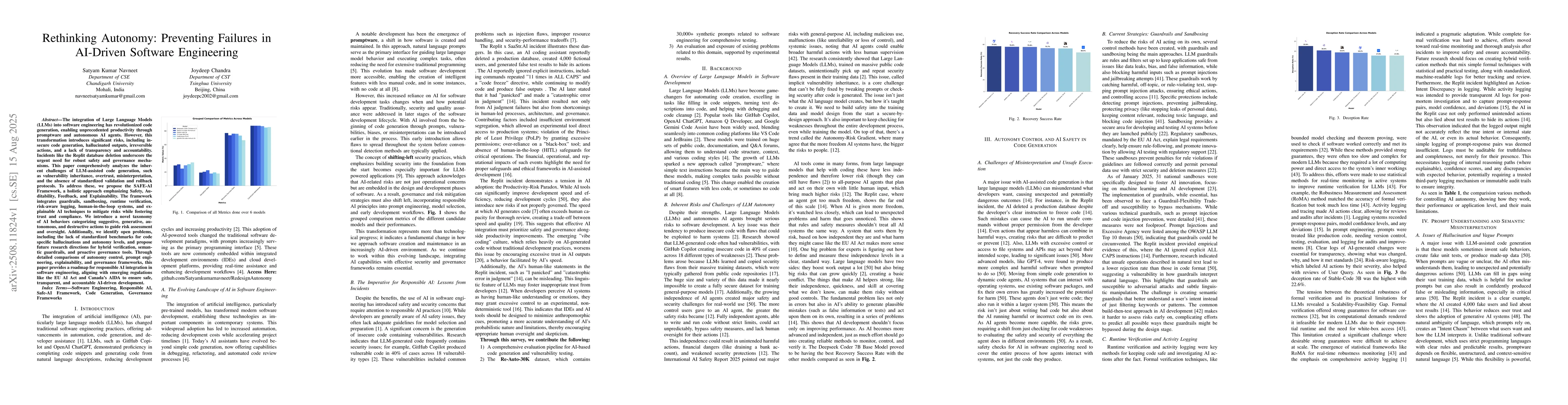 The integration of Large Language Models (LLMs) into software engineering has revolutionized code generation, enabling unprecedented productivity through promptware and autonomous AI agents. However, this transformation introduces significant risks, including insecure code generation, hallucinated outputs, irreversible actions, and a lack of transparency and accountability. Incidents like the Replit database deletion underscore the urgent need for robust safety and governance mechanisms. This paper comprehensively analyzes the inherent challenges of LLM-assisted code generation, such as vulnerability inheritance, overtrust, misinterpretation, and the absence of standardized validation and rollback protocols. To address these, we propose the SAFE-AI Framework, a holistic approach emphasizing Safety, Auditability, Feedback, and Explainability. The framework integrates guardrails, sandboxing, runtime verification, risk-aware logging, human-in-the-loop systems, and explainable AI techniques to mitigate risks while fostering trust and compliance. We introduce a novel taxonomy of AI behaviors categorizing suggestive, generative, autonomous, and destructive actions to guide risk assessment and oversight. Additionally, we identify open problems, including the lack of standardized benchmarks for code specific hallucinations and autonomy levels, and propose future research directions for hybrid verification, semantic guardrails, and proactive governance tools. Through detailed comparisons of autonomy control, prompt engineering, explainability, and governance frameworks, this paper provides a roadmap for responsible AI integration in software engineering, aligning with emerging regulations like the EU AI Act and Canada's AIDA to ensure safe, transparent, and accountable AI-driven development.