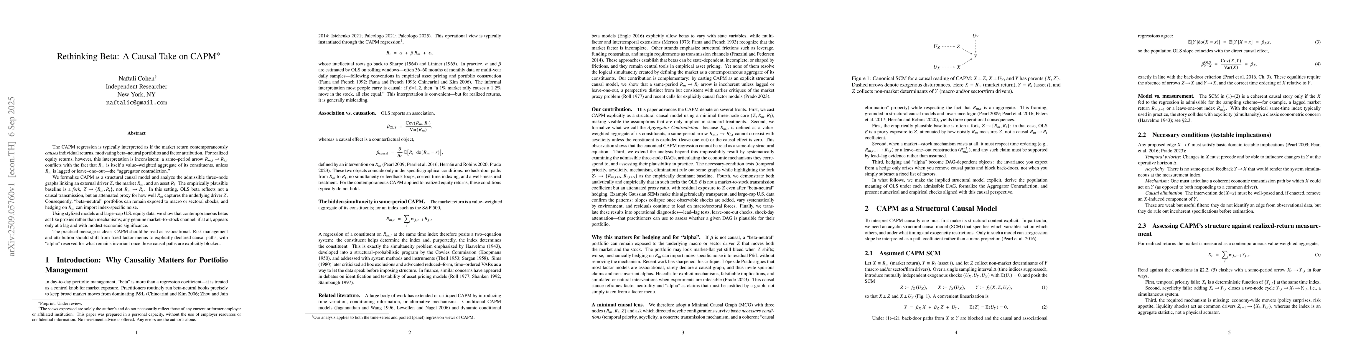The CAPM regression is typically interpreted as if the market return contemporaneously \emph{causes} individual returns, motivating beta-neutral portfolios and factor attribution. For realized equity returns, however, this interpretation is inconsistent: a same-period arrow $R_{m,t} \to R_{i,t}$ conflicts with the fact that $R_m$ is itself a value-weighted aggregate of its constituents, unless $R_m$ is lagged or leave-one-out -- the ``aggregator contradiction.'' We formalize CAPM as a structural causal model and analyze the admissible three-node graphs linking an external driver $Z$, the market $R_m$, and an asset $R_i$. The empirically plausible baseline is a \emph{fork}, $Z \to \{R_m, R_i\}$, not $R_m \to R_i$. In this setting, OLS beta reflects not a causal transmission, but an attenuated proxy for how well $R_m$ captures the underlying driver $Z$. Consequently, ``beta-neutral'' portfolios can remain exposed to macro or sectoral shocks, and hedging on $R_m$ can import index-specific noise. Using stylized models and large-cap U.S.\ equity data, we show that contemporaneous betas act like proxies rather than mechanisms; any genuine market-to-stock channel, if at all, appears only at a lag and with modest economic significance. The practical message is clear: CAPM should be read as associational. Risk management and attribution should shift from fixed factor menus to explicitly declared causal paths, with ``alpha'' reserved for what remains invariant once those causal paths are explicitly blocked.