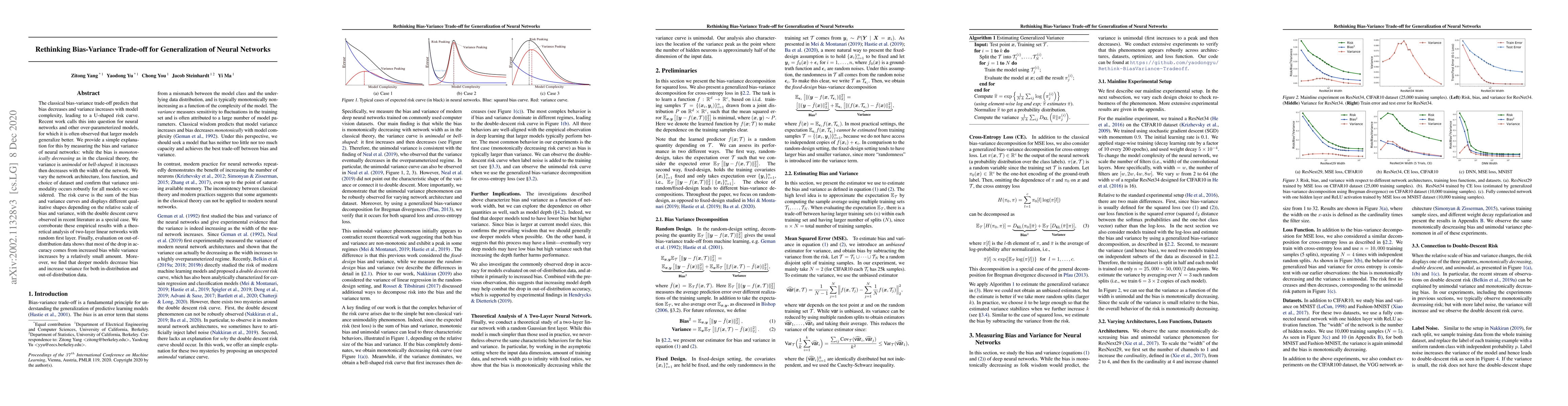 This paper challenges the classical bias-variance trade-off in neural networks, showing that while bias decreases with complexity, variance follows a unimodal pattern, increasing then decreasing. This leads to different risk curve shapes, including the "double descent" phenomenon, and suggests deeper models improve generalization despite higher variance.