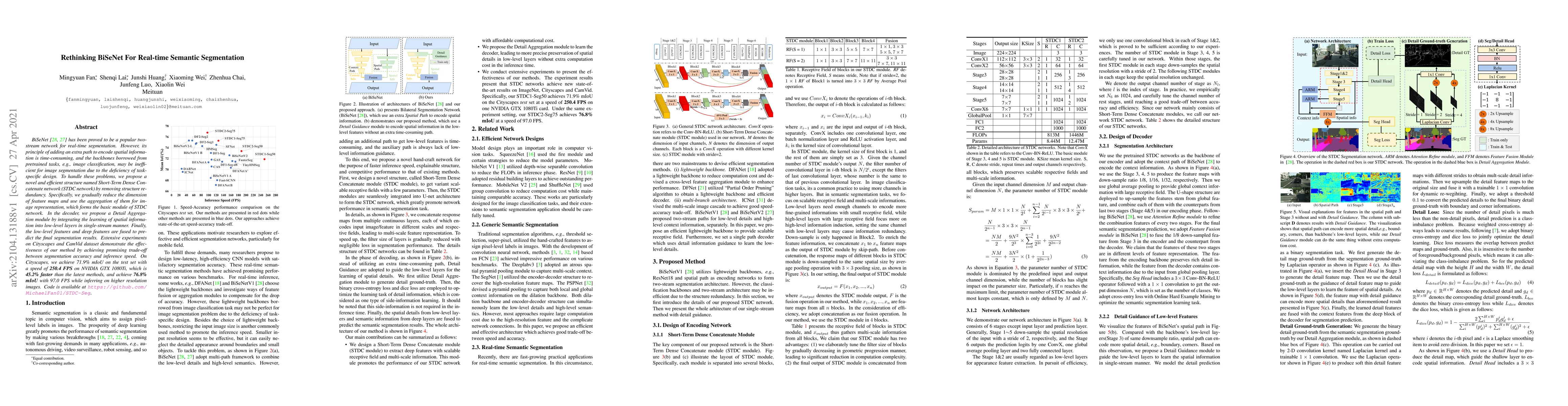 This paper proposes a novel Short-Term Dense Concatenate network (STDC network) to improve the efficiency of BiSeNet for real-time semantic segmentation. The method reduces feature map redundancy and integrates spatial information learning into low-level layers, achieving a balance between accuracy and speed, with notable improvements on Cityscapes and CamVid datasets.