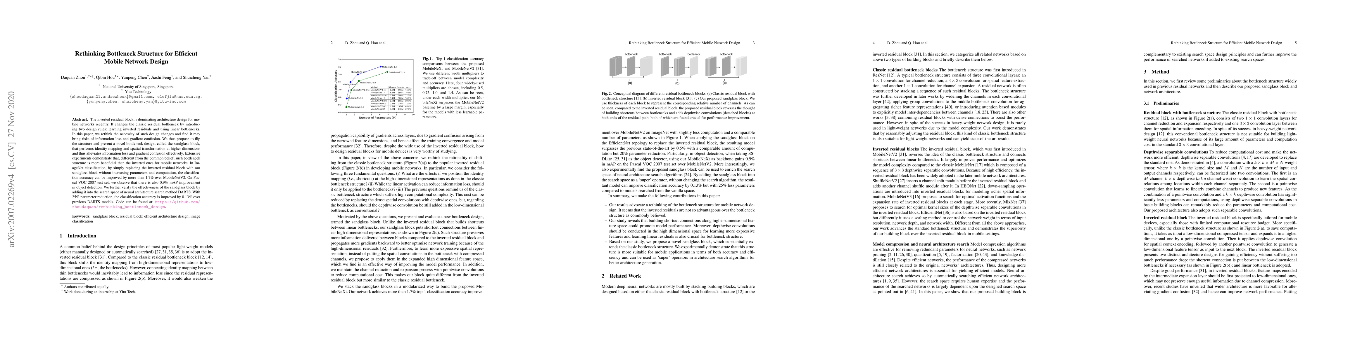 This paper challenges the dominant inverted residual block in mobile networks, proposing a novel 'sandglass block' that improves accuracy by over 1.7% on ImageNet and 0.9% on Pascal VOC 2007 without extra parameters or computation. It also enhances DARTS model performance with a 25% parameter reduction.