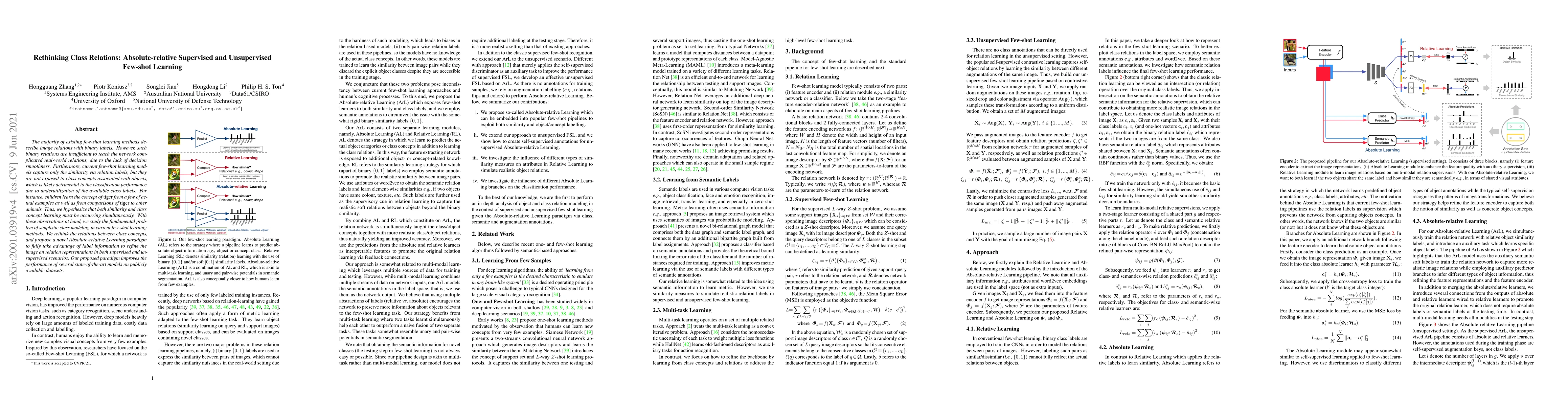 The majority of existing few-shot learning methods describe image relations with binary labels. However, such binary relations are insufficient to teach the network complicated real-world relations, due to the lack of decision smoothness. Furthermore, current few-shot learning models capture only the similarity via relation labels, but they are not exposed to class concepts associated with objects, which is likely detrimental to the classification performance due to underutilization of the available class labels. To paraphrase, children learn the concept of tiger from a few of actual examples as well as from comparisons of tiger to other animals. Thus, we hypothesize that in fact both similarity and class concept learning must be occurring simultaneously. With these observations at hand, we study the fundamental problem of simplistic class modeling in current few-shot learning methods. We rethink the relations between class concepts, and propose a novel Absolute-relative Learning paradigm to fully take advantage of label information to refine the image representations and correct the relation understanding in both supervised and unsupervised scenarios. Our proposed paradigm improves the performance of several the state-of-the-art models on publicly available datasets.