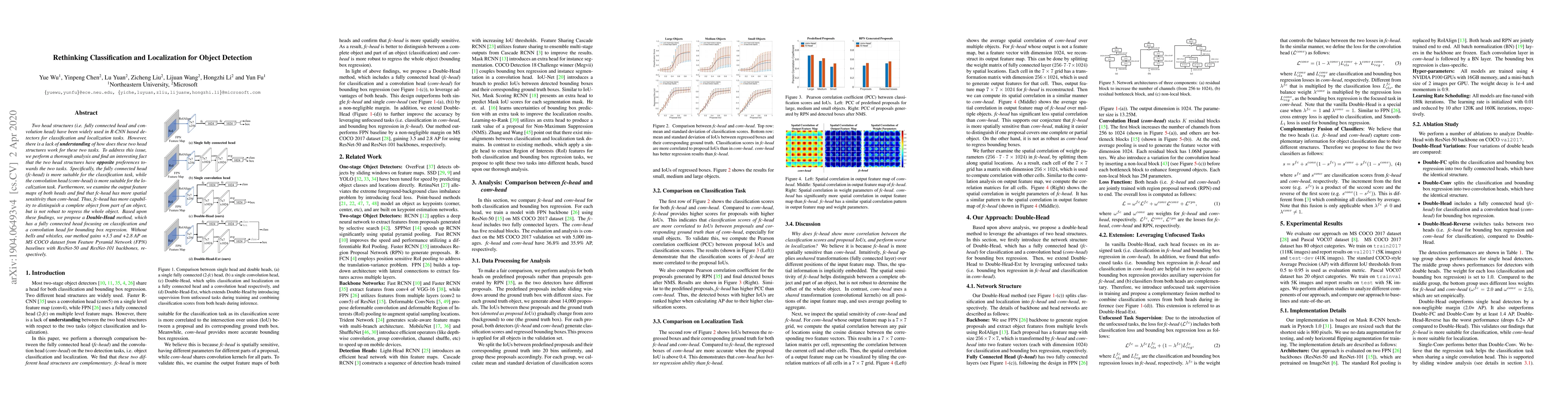 Two head structures (i.e. fully connected head and convolution head) have been widely used in R-CNN based detectors for classification and localization tasks. However, there is a lack of understanding of how does these two head structures work for these two tasks. To address this issue, we perform a thorough analysis and find an interesting fact that the two head structures have opposite preferences towards the two tasks. Specifically, the fully connected head (fc-head) is more suitable for the classification task, while the convolution head (conv-head) is more suitable for the localization task. Furthermore, we examine the output feature maps of both heads and find that fc-head has more spatial sensitivity than conv-head. Thus, fc-head has more capability to distinguish a complete object from part of an object, but is not robust to regress the whole object. Based upon these findings, we propose a Double-Head method, which has a fully connected head focusing on classification and a convolution head for bounding box regression. Without bells and whistles, our method gains +3.5 and +2.8 AP on MS COCO dataset from Feature Pyramid Network (FPN) baselines with ResNet-50 and ResNet-101 backbones, respectively.