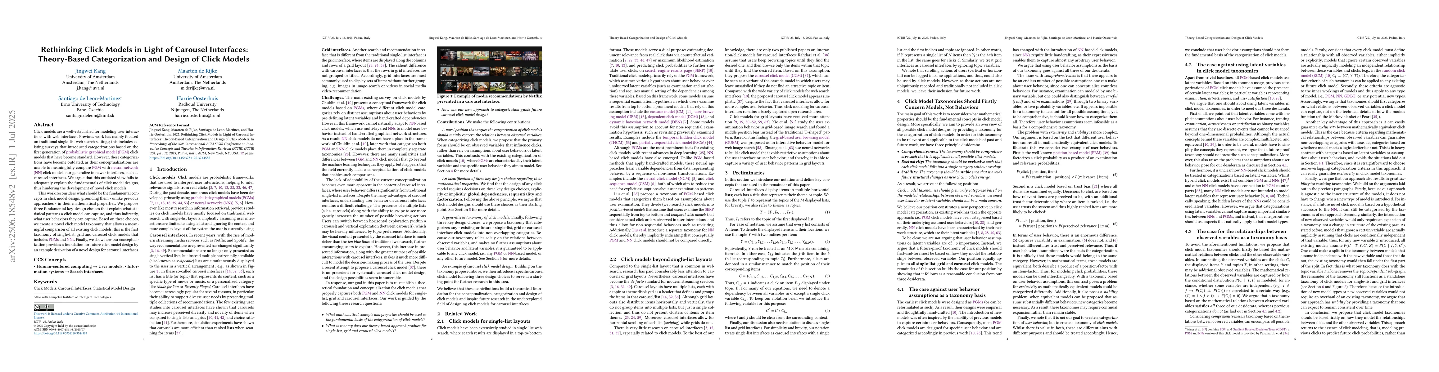 Click models are a well-established for modeling user interactions with web interfaces. Previous work has mainly focused on traditional single-list web search settings; this includes existing surveys that introduced categorizations based on the first generation of probabilistic graphical model (PGM) click models that have become standard. However, these categorizations have become outdated, as their conceptualizations are unable to meaningfully compare PGM with neural network (NN) click models nor generalize to newer interfaces, such as carousel interfaces. We argue that this outdated view fails to adequately explain the fundamentals of click model designs, thus hindering the development of novel click models. This work reconsiders what should be the fundamental concepts in click model design, grounding them - unlike previous approaches - in their mathematical properties. We propose three fundamental key-design choices that explain what statistical patterns a click model can capture, and thus indirectly, what user behaviors they can capture. Based on these choices, we create a novel click model taxonomy that allows a meaningful comparison of all existing click models; this is the first taxonomy of single-list, grid and carousel click models that includes PGMs and NNs. Finally, we show how our conceptualization provides a foundation for future click model design by an example derivation of a novel design for carousel interfaces.