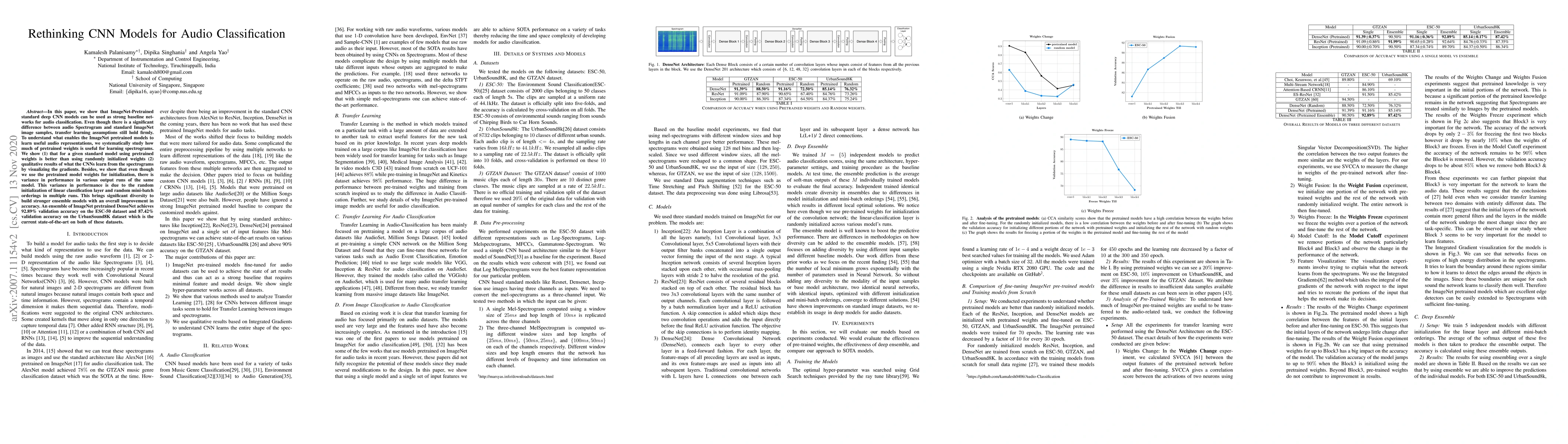 In this paper, we show that ImageNet-Pretrained standard deep CNN models can be used as strong baseline networks for audio classification. Even though there is a significant difference between audio Spectrogram and standard ImageNet image samples, transfer learning assumptions still hold firmly. To understand what enables the ImageNet pretrained models to learn useful audio representations, we systematically study how much of pretrained weights is useful for learning spectrograms. We show (1) that for a given standard model using pretrained weights is better than using randomly initialized weights (2) qualitative results of what the CNNs learn from the spectrograms by visualizing the gradients. Besides, we show that even though we use the pretrained model weights for initialization, there is variance in performance in various output runs of the same model. This variance in performance is due to the random initialization of linear classification layer and random mini-batch orderings in multiple runs. This brings significant diversity to build stronger ensemble models with an overall improvement in accuracy. An ensemble of ImageNet pretrained DenseNet achieves 92.89% validation accuracy on the ESC-50 dataset and 87.42% validation accuracy on the UrbanSound8K dataset which is the current state-of-the-art on both of these datasets.