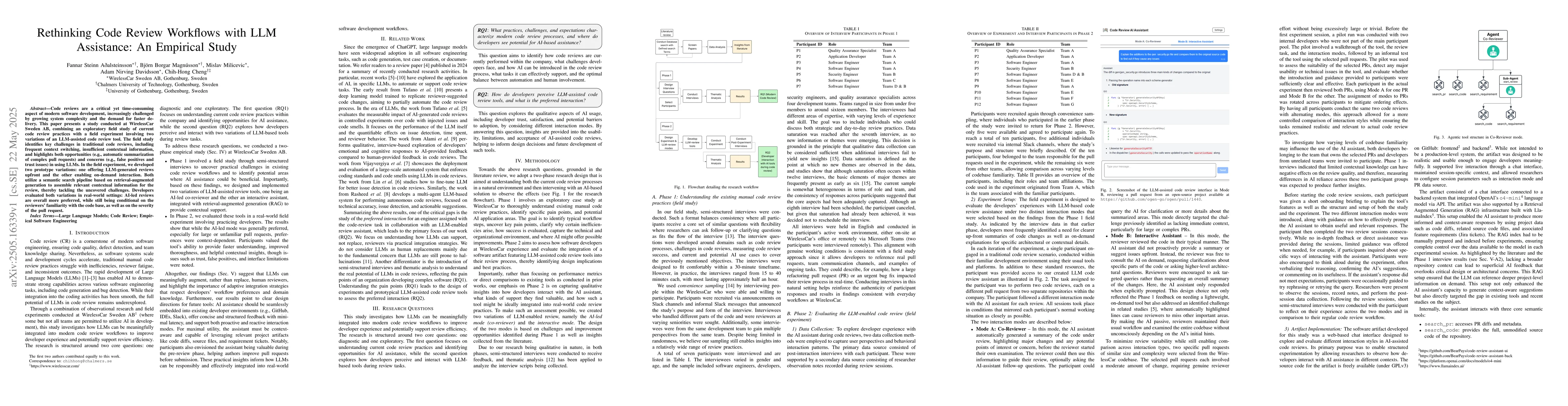 The study combines an exploratory field study of current code review practices at WirelessCar Sweden AB with a field experiment involving two variations of an LLM-assisted code review tool.