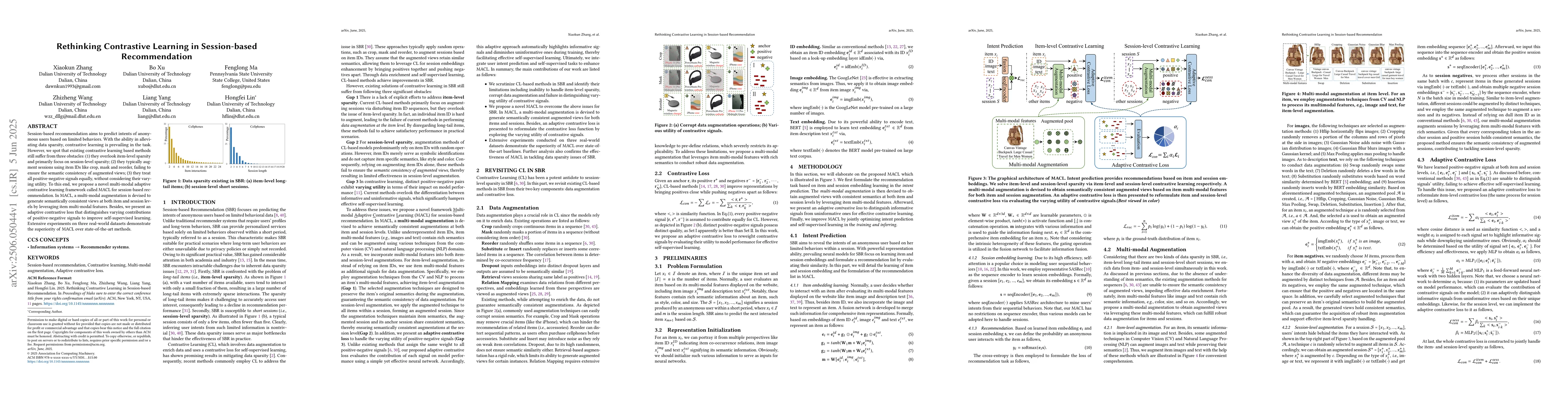 A new framework called MACL improves session-based recommendation by addressing data sparsity issues through adaptive contrastive learning with semantically consistent views and varying utility of positive-negative signals.