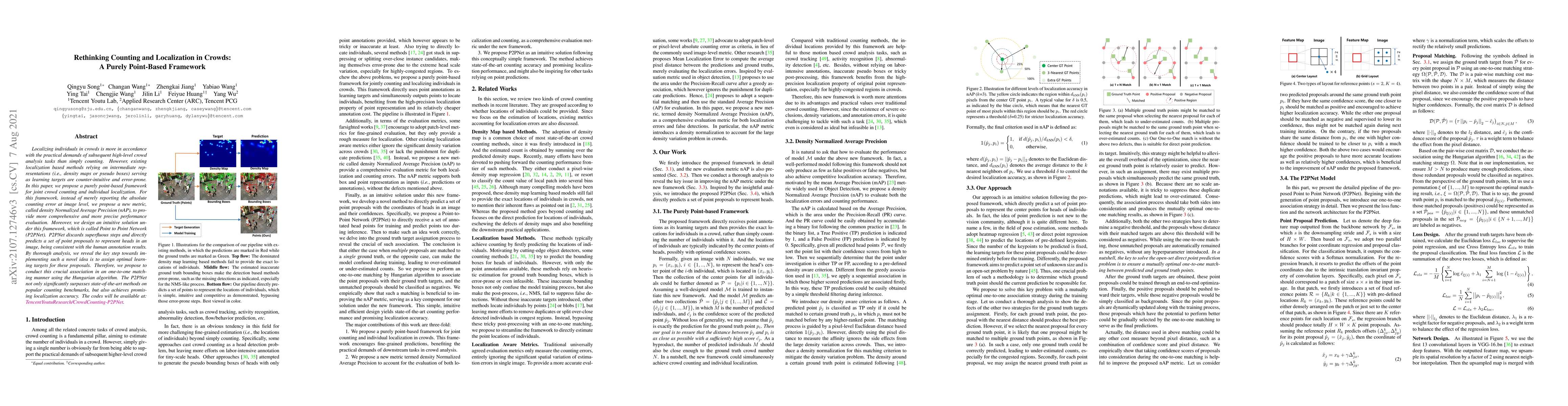 This paper proposes a purely point-based framework for joint crowd counting and individual localization, introducing a new metric, density Normalized Average Precision (nAP), for performance evaluation. The Point to Point Network (P2PNet) directly predicts point proposals for heads, achieving superior results in both counting and localization accuracy.