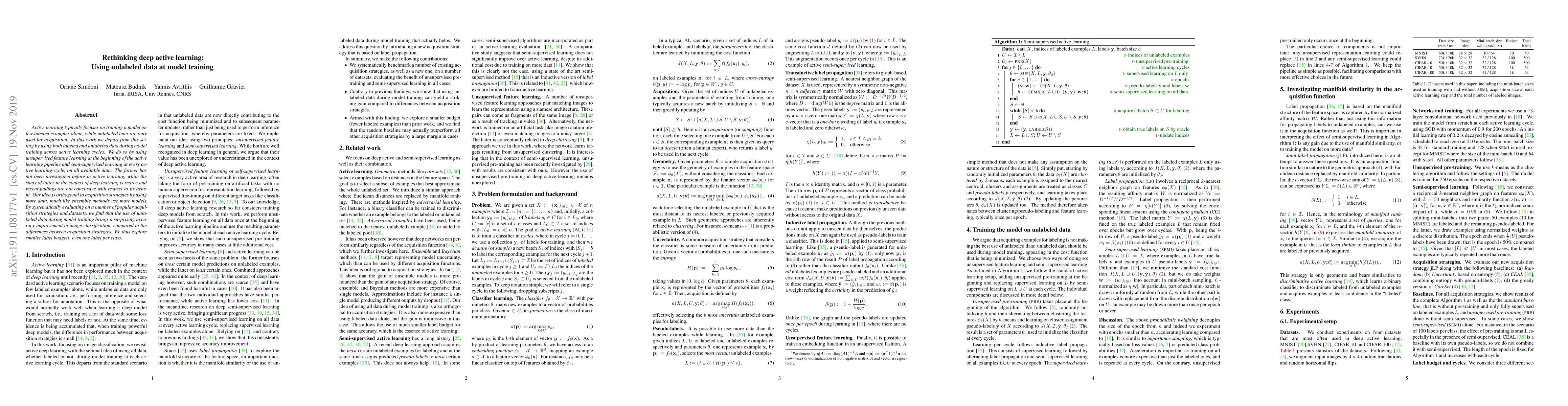 This paper proposes using both labeled and unlabeled data during model training in active learning to improve accuracy, employing unsupervised feature learning initially and semi-supervised learning in subsequent cycles. The results show significant accuracy gains in image classification, suggesting that utilizing unlabeled data during training can outperform traditional acquisition strategies.