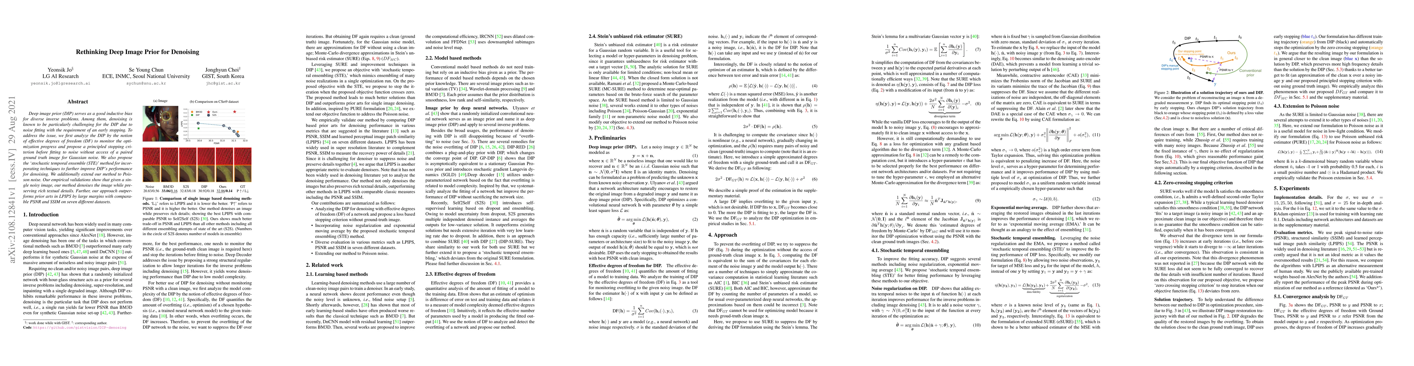 Deep image prior (DIP) serves as a good inductive bias for diverse inverse problems. Among them, denoising is known to be particularly challenging for the DIP due to noise fitting with the requirement of an early stopping. To address the issue, we first analyze the DIP by the notion of effective degrees of freedom (DF) to monitor the optimization progress and propose a principled stopping criterion before fitting to noise without access of a paired ground truth image for Gaussian noise. We also propose the `stochastic temporal ensemble (STE)' method for incorporating techniques to further improve DIP's performance for denoising. We additionally extend our method to Poisson noise. Our empirical validations show that given a single noisy image, our method denoises the image while preserving rich textual details. Further, our approach outperforms prior arts in LPIPS by large margins with comparable PSNR and SSIM on seven different datasets.