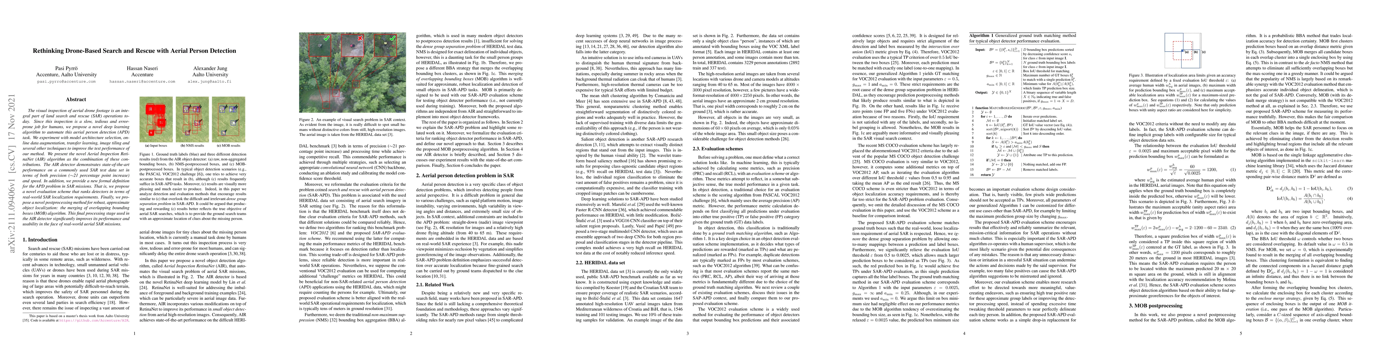 The visual inspection of aerial drone footage is an integral part of land search and rescue (SAR) operations today. Since this inspection is a slow, tedious and error-prone job for humans, we propose a novel deep learning algorithm to automate this aerial person detection (APD) task. We experiment with model architecture selection, online data augmentation, transfer learning, image tiling and several other techniques to improve the test performance of our method. We present the novel Aerial Inspection RetinaNet (AIR) algorithm as the combination of these contributions. The AIR detector demonstrates state-of-the-art performance on a commonly used SAR test data set in terms of both precision (~21 percentage point increase) and speed. In addition, we provide a new formal definition for the APD problem in SAR missions. That is, we propose a novel evaluation scheme that ranks detectors in terms of real-world SAR localization requirements. Finally, we propose a novel postprocessing method for robust, approximate object localization: the merging of overlapping bounding boxes (MOB) algorithm. This final processing stage used in the AIR detector significantly improves its performance and usability in the face of real-world aerial SAR missions.