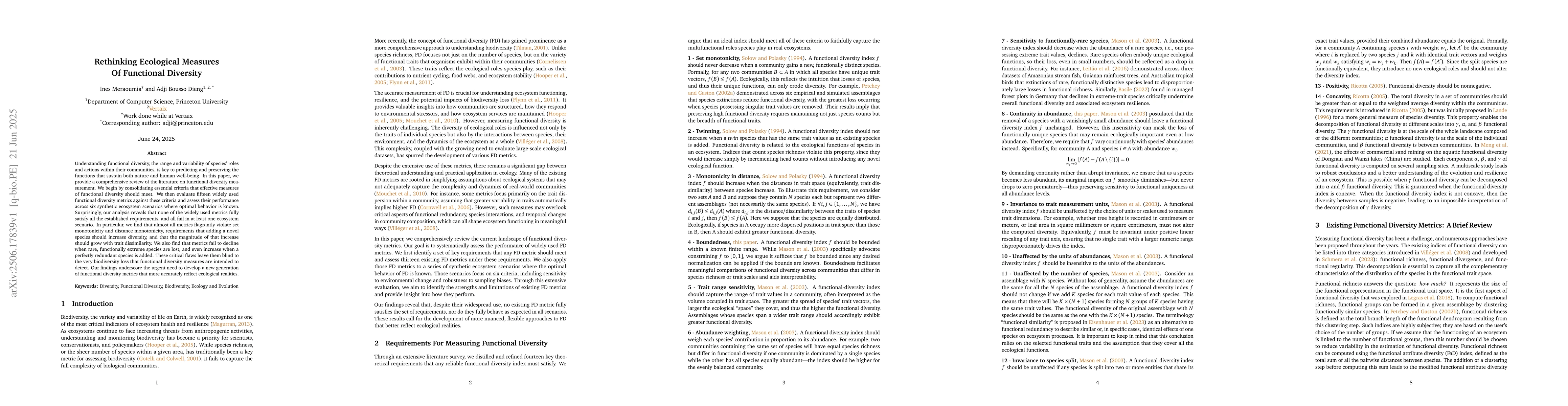 Understanding functional diversity, the range and variability of species' roles and actions within their communities, is key to predicting and preserving the functions that sustain both nature and human well-being. In this paper, we provide a comprehensive review of the literature on functional diversity measurement. We begin by consolidating essential criteria that effective measures of functional diversity should meet. We then evaluate fifteen widely used functional diversity metrics against these criteria and assess their performance across six synthetic ecosystem scenarios where optimal behavior is known. Surprisingly, our analysis reveals that none of the widely used metrics fully satisfy all the established requirements, and all fail in at least one ecosystem scenario. In particular, we find that almost all metrics flagrantly violate set monotonicity and distance monotonicity, requirements that adding a novel species should increase diversity, and that the magnitude of that increase should grow with trait dissimilarity. We also find that metrics fail to decline when rare, functionally extreme species are lost, and even increase when a perfectly redundant species is added. These critical flaws leave them blind to the very biodiversity loss that functional diversity measures are intended to detect. Our findings underscore the urgent need to develop a new generation of functional diversity metrics that more accurately reflect ecological realities.