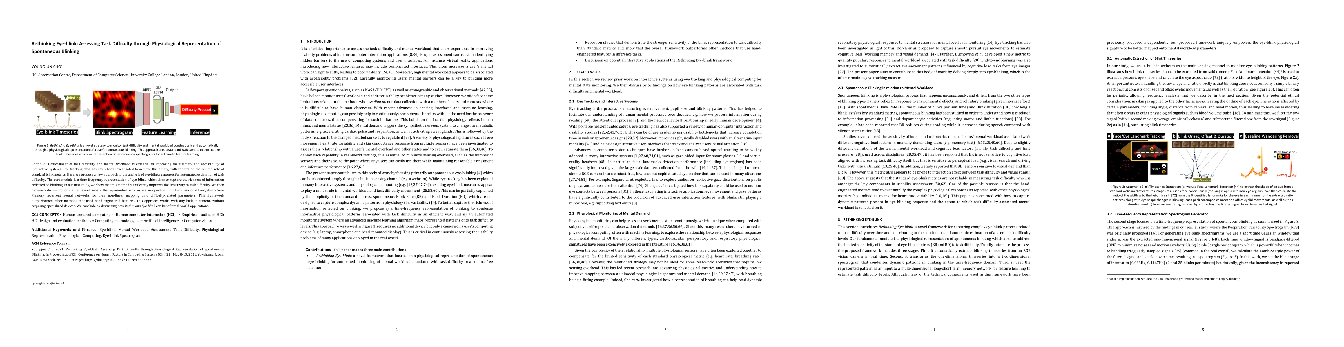 Continuous assessment of task difficulty and mental workload is essential in improving the usability and accessibility of interactive systems. Eye tracking data has often been investigated to achieve this ability, with reports on the limited role of standard blink metrics. Here, we propose a new approach to the analysis of eye-blink responses for automated estimation of task difficulty. The core module is a time-frequency representation of eye-blink, which aims to capture the richness of information reflected on blinking. In our first study, we show that this method significantly improves the sensitivity to task difficulty. We then demonstrate how to form a framework where the represented patterns are analyzed with multi-dimensional Long Short-Term Memory recurrent neural networks for their non-linear mapping onto difficulty-related parameters. This framework outperformed other methods that used hand-engineered features. This approach works with any built-in camera, without requiring specialized devices. We conclude by discussing how Rethinking Eye-blink can benefit real-world applications.