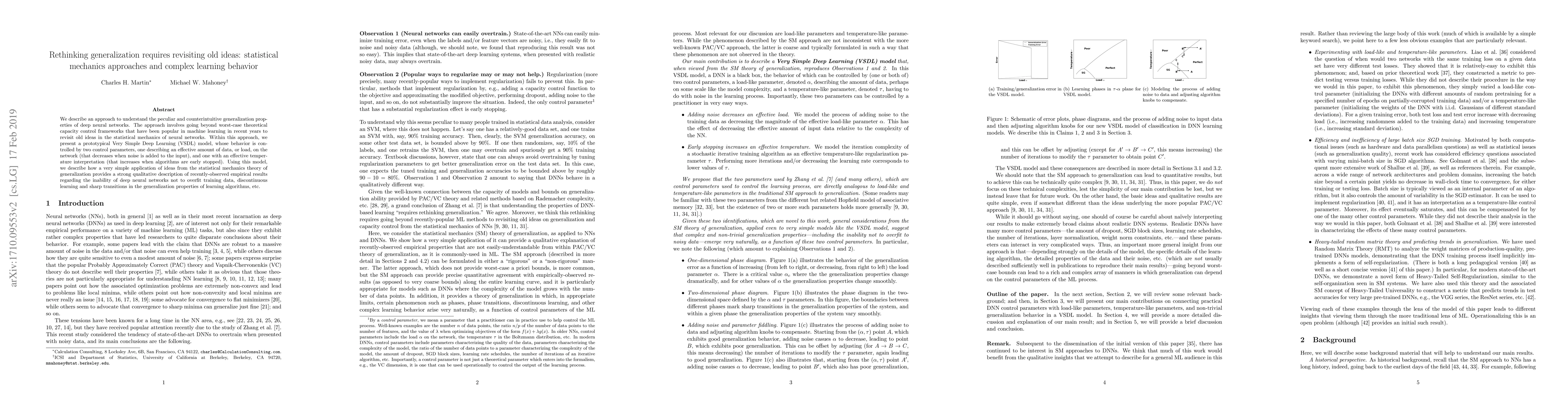We describe an approach to understand the peculiar and counterintuitive generalization properties of deep neural networks. The approach involves going beyond worst-case theoretical capacity control frameworks that have been popular in machine learning in recent years to revisit old ideas in the statistical mechanics of neural networks. Within this approach, we present a prototypical Very Simple Deep Learning (VSDL) model, whose behavior is controlled by two control parameters, one describing an effective amount of data, or load, on the network (that decreases when noise is added to the input), and one with an effective temperature interpretation (that increases when algorithms are early stopped). Using this model, we describe how a very simple application of ideas from the statistical mechanics theory of generalization provides a strong qualitative description of recently-observed empirical results regarding the inability of deep neural networks not to overfit training data, discontinuous learning and sharp transitions in the generalization properties of learning algorithms, etc.