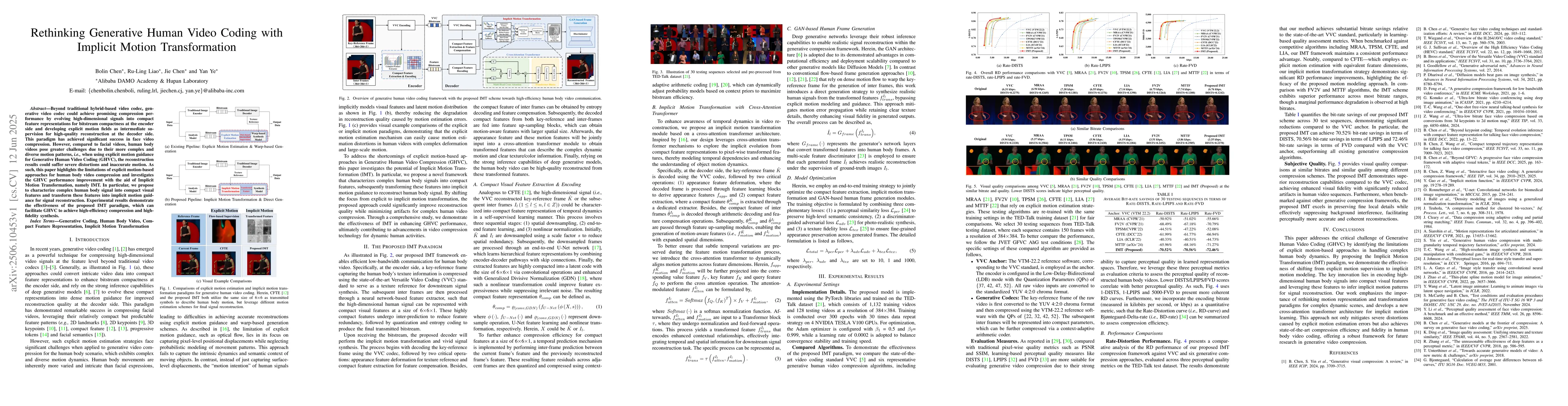 This paper proposes a new approach to compressing human body videos using generative video coding, which improves compression efficiency and fidelity through implicit motion transformation, achieving better results than traditional explicit motion-based approaches.