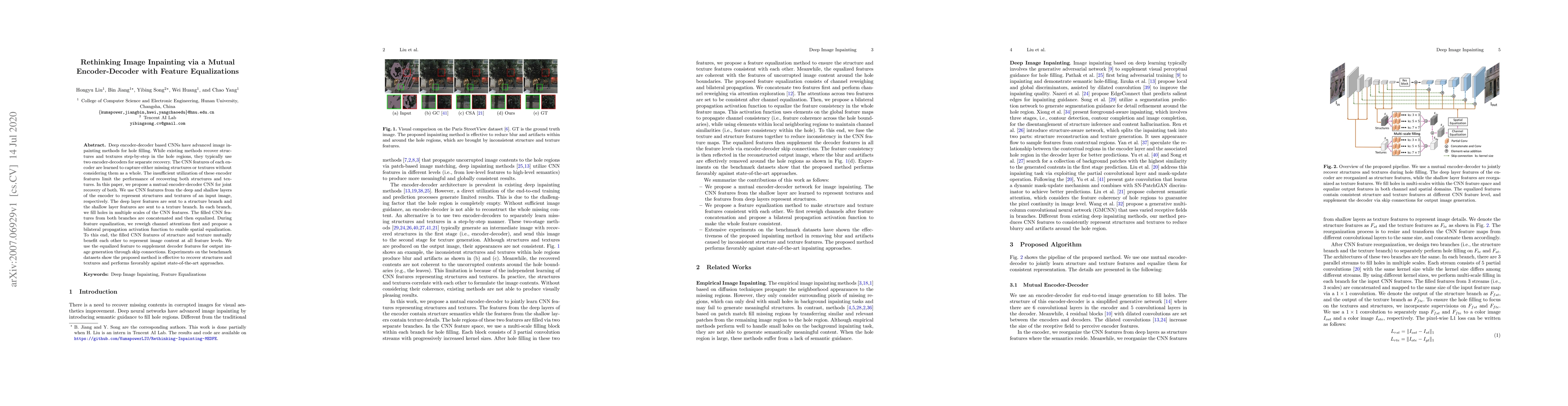 This paper introduces a novel mutual encoder-decoder CNN method for image inpainting, utilizing both deep and shallow layer features to jointly recover image structures and textures. The approach equalizes these features through channel attention reweighting and a bilateral propagation activation function, enhancing the recovery process and outperforming existing methods on benchmark datasets.