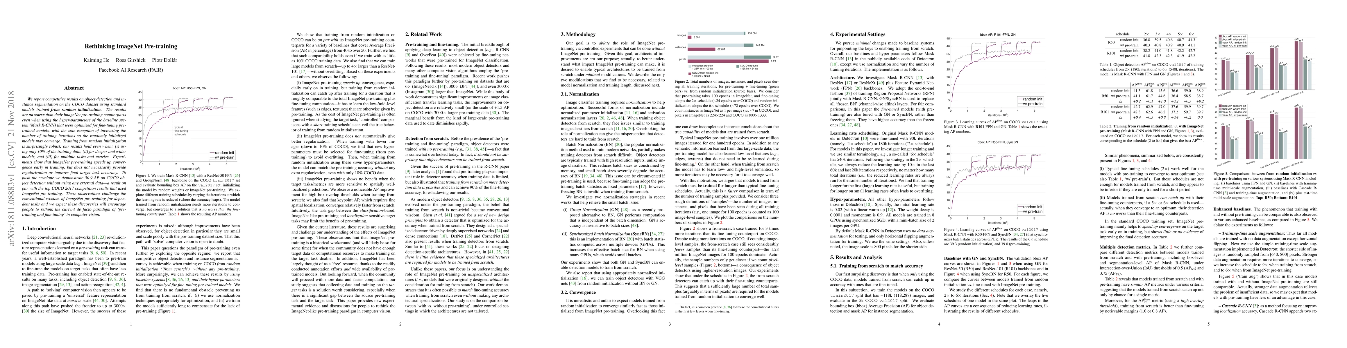 This paper demonstrates that standard models trained from random initialization can achieve competitive results on object detection and instance segmentation tasks, comparable to those pre-trained on ImageNet, even when using hyperparameters optimized for pre-trained models. The findings challenge the necessity of ImageNet pre-training, suggesting that training from scratch can be surprisingly effective.