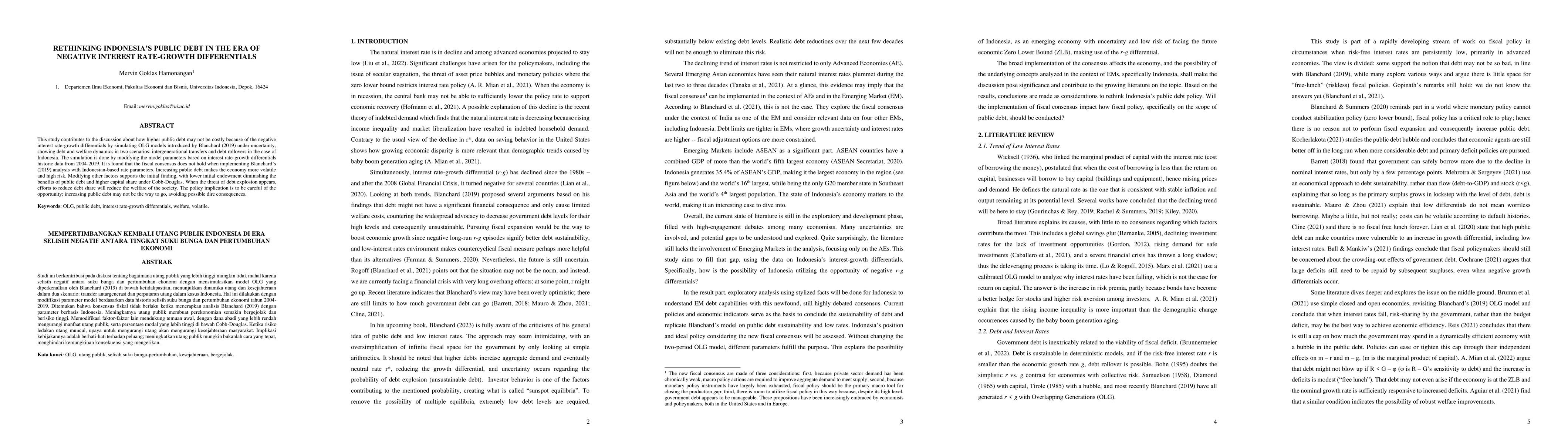 This study contributes to the discussion about how higher public debt may not be costly because of the negative interest rate-growth differentials by simulating OLG models introduced by Blanchard (2019) under uncertainty, showing debt and welfare dynamics in two scenarios: intergenerational transfers and debt rollovers in the case of Indonesia. The simulation is done by modifying the model parameters based on interest rate-growth differentials historic data from 2004-2019. It is found that the fiscal consensus does not hold when implementing Blanchard (2019) analysis with Indonesian-based rate parameters. Increasing public debt makes the economy more volatile and high risk. Modifying other factors supports the initial finding, with lower initial endowment diminishing the benefits of public debt and higher capital share under Cobb-Douglas. When the threat of debt explosion appears, efforts to reduce debt share will reduce the welfare of the society. The policy implication is to be careful of the opportunity. Increasing public debt may not be the way to go, avoiding possible dire consequences.