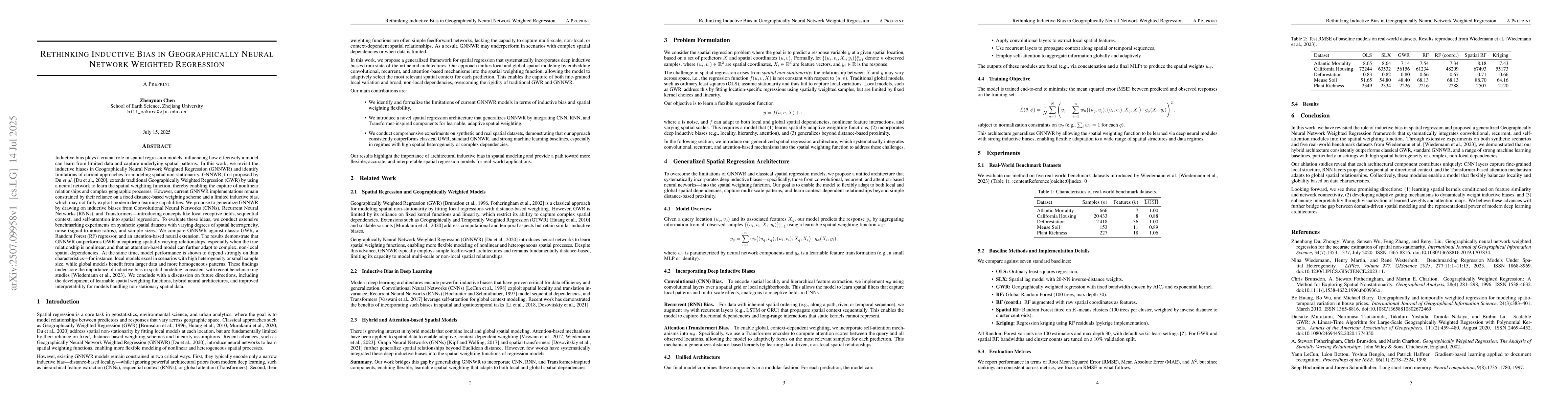 Inductive bias is a key factor in spatial regression models, determining how well a model can learn from limited data and capture spatial patterns. This work revisits the inductive biases in Geographically Neural Network Weighted Regression (GNNWR) and identifies limitations in current approaches for modeling spatial non-stationarity. While GNNWR extends traditional Geographically Weighted Regression by using neural networks to learn spatial weighting functions, existing implementations are often restricted by fixed distance-based schemes and limited inductive bias. We propose to generalize GNNWR by incorporating concepts from convolutional neural networks, recurrent neural networks, and transformers, introducing local receptive fields, sequential context, and self-attention into spatial regression. Through extensive benchmarking on synthetic spatial datasets with varying heterogeneity, noise, and sample sizes, we show that GNNWR outperforms classic methods in capturing nonlinear and complex spatial relationships. Our results also reveal that model performance depends strongly on data characteristics, with local models excelling in highly heterogeneous or small-sample scenarios, and global models performing better with larger, more homogeneous data. These findings highlight the importance of inductive bias in spatial modeling and suggest future directions, including learnable spatial weighting functions, hybrid neural architectures, and improved interpretability for models handling non-stationary spatial data.