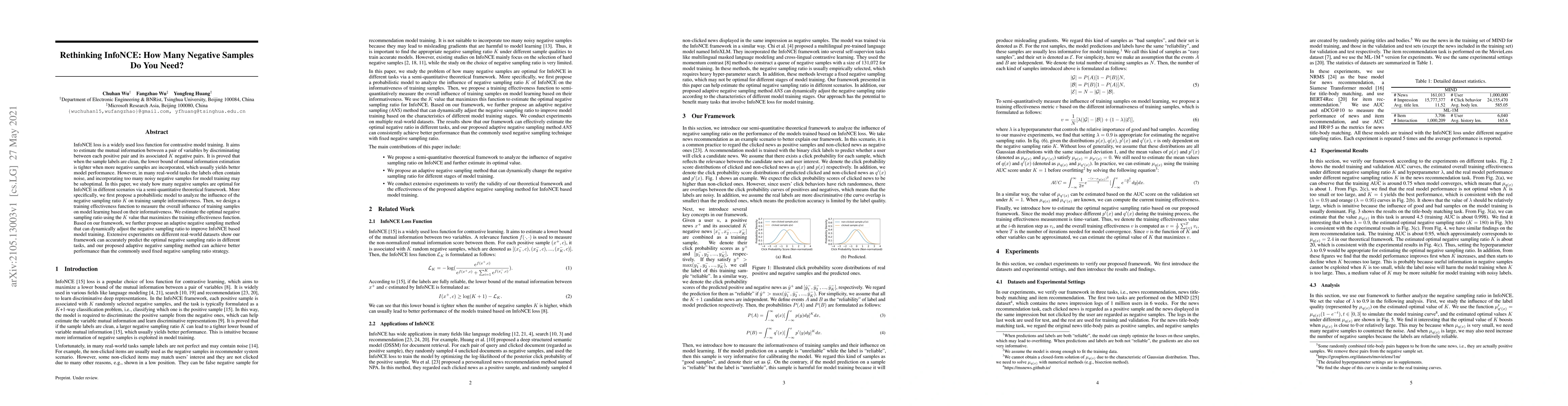 InfoNCE loss is a widely used loss function for contrastive model training. It aims to estimate the mutual information between a pair of variables by discriminating between each positive pair and its associated $K$ negative pairs. It is proved that when the sample labels are clean, the lower bound of mutual information estimation is tighter when more negative samples are incorporated, which usually yields better model performance. However, in many real-world tasks the labels often contain noise, and incorporating too many noisy negative samples for model training may be suboptimal. In this paper, we study how many negative samples are optimal for InfoNCE in different scenarios via a semi-quantitative theoretical framework. More specifically, we first propose a probabilistic model to analyze the influence of the negative sampling ratio $K$ on training sample informativeness. Then, we design a training effectiveness function to measure the overall influence of training samples on model learning based on their informativeness. We estimate the optimal negative sampling ratio using the $K$ value that maximizes the training effectiveness function. Based on our framework, we further propose an adaptive negative sampling method that can dynamically adjust the negative sampling ratio to improve InfoNCE based model training. Extensive experiments on different real-world datasets show our framework can accurately predict the optimal negative sampling ratio in different tasks, and our proposed adaptive negative sampling method can achieve better performance than the commonly used fixed negative sampling ratio strategy.