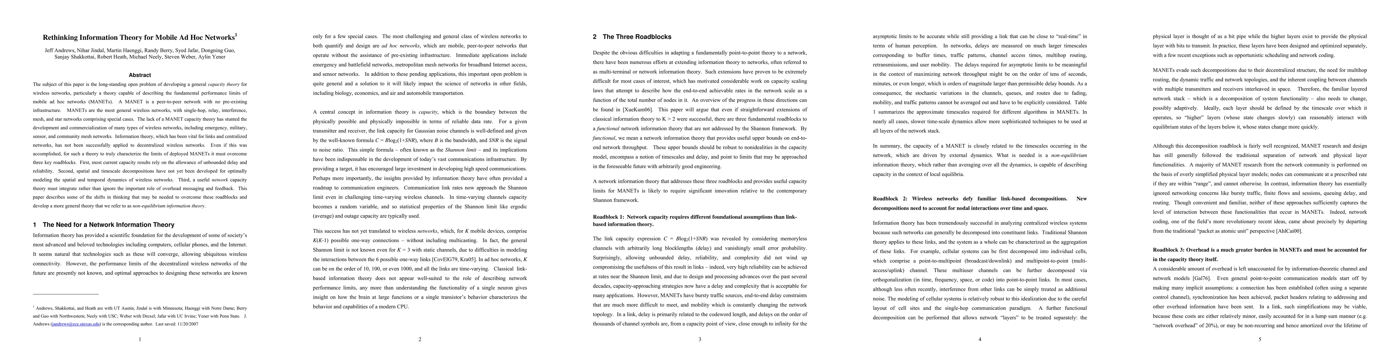 The subject of this paper is the long-standing open problem of developing a general capacity theory for wireless networks, particularly a theory capable of describing the fundamental performance limits of mobile ad hoc networks (MANETs). A MANET is a peer-to-peer network with no pre-existing infrastructure. MANETs are the most general wireless networks, with single-hop, relay, interference, mesh, and star networks comprising special cases. The lack of a MANET capacity theory has stunted the development and commercialization of many types of wireless networks, including emergency, military, sensor, and community mesh networks. Information theory, which has been vital for links and centralized networks, has not been successfully applied to decentralized wireless networks. Even if this was accomplished, for such a theory to truly characterize the limits of deployed MANETs it must overcome three key roadblocks. First, most current capacity results rely on the allowance of unbounded delay and reliability. Second, spatial and timescale decompositions have not yet been developed for optimally modeling the spatial and temporal dynamics of wireless networks. Third, a useful network capacity theory must integrate rather than ignore the important role of overhead messaging and feedback. This paper describes some of the shifts in thinking that may be needed to overcome these roadblocks and develop a more general theory that we refer to as non-equilibrium information theory.